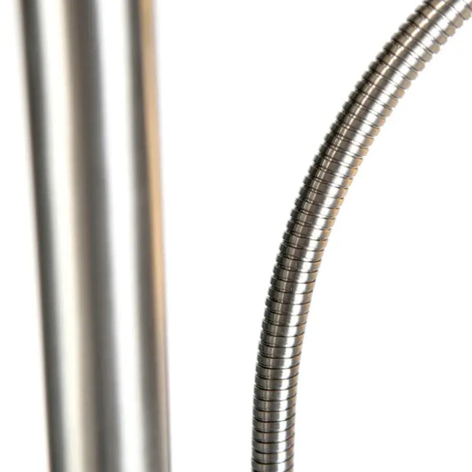Deze lamp is 158 cm hoog en de flexarm is 30 cm lang. De vloerlamp heeft enkel nog twee lichtbronnen nodig. Kies voor de hoofdlamp een E27 lichtbron met wat minder lumen voor sfeer en in de leeslamp een sterke E14 lichtbron zodat je goed kunt lezen.