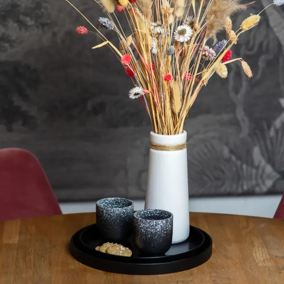 Dit dienblad in het zwart is een elegante verschijning op tafel. De combinatie van de zwarte kleur met het houten materiaal zorgt ervoor dat het dienblad goed bij diverse woonstijlen past. Het dienblad is zowel elegant als stoer. Heb je het dienblad niet nodig om drankjes en hapjes te serveren? Zet wat mooie woondecoratie op het blad en gebruik het als extra decoratie in jouw interieur. Zo komt dit houten ronde dienblad altijd wel van pas.