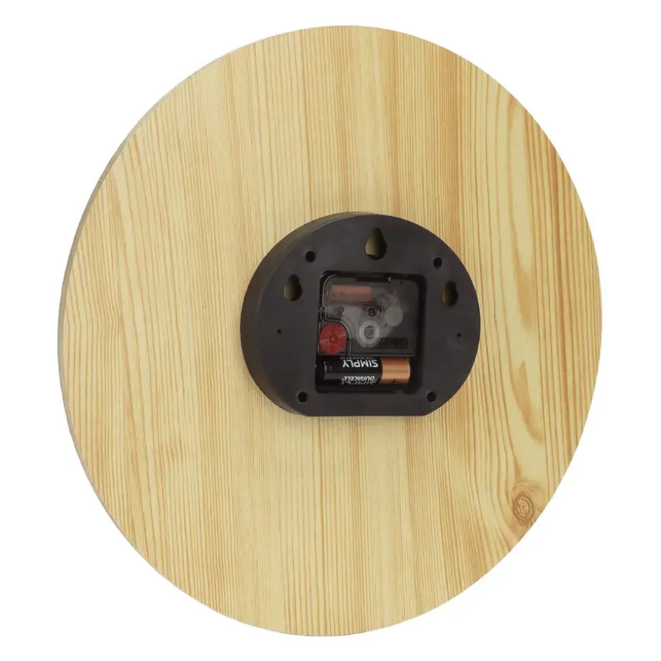 De klok is uitgevoerd in lichtbruin hout met zwarte cijfers en zwarte wijzers. Hierdoor is de klok ook vanaf een afstandje altijd duidelijk af te lezen. Bovendien past deze minimalistische stijl in veel verschillende interieurs. Zo past de houten klok perfect in een bohemian ingericht huis, maar staat het ook mooi in een modern of Scandinavisch interieur. De anderskleurige zijkant maakt het geheel helemaal af.