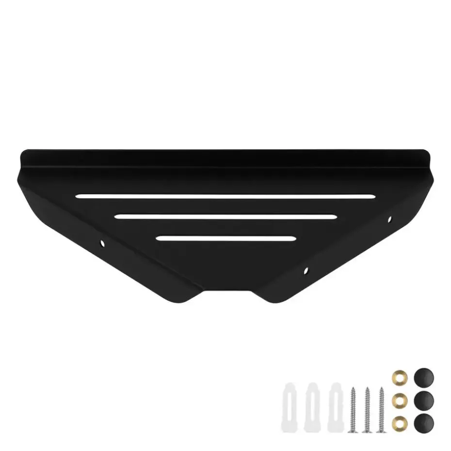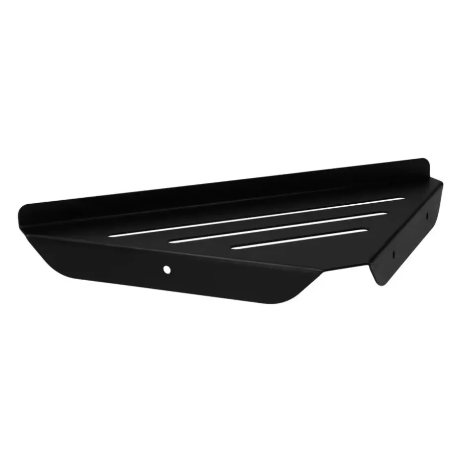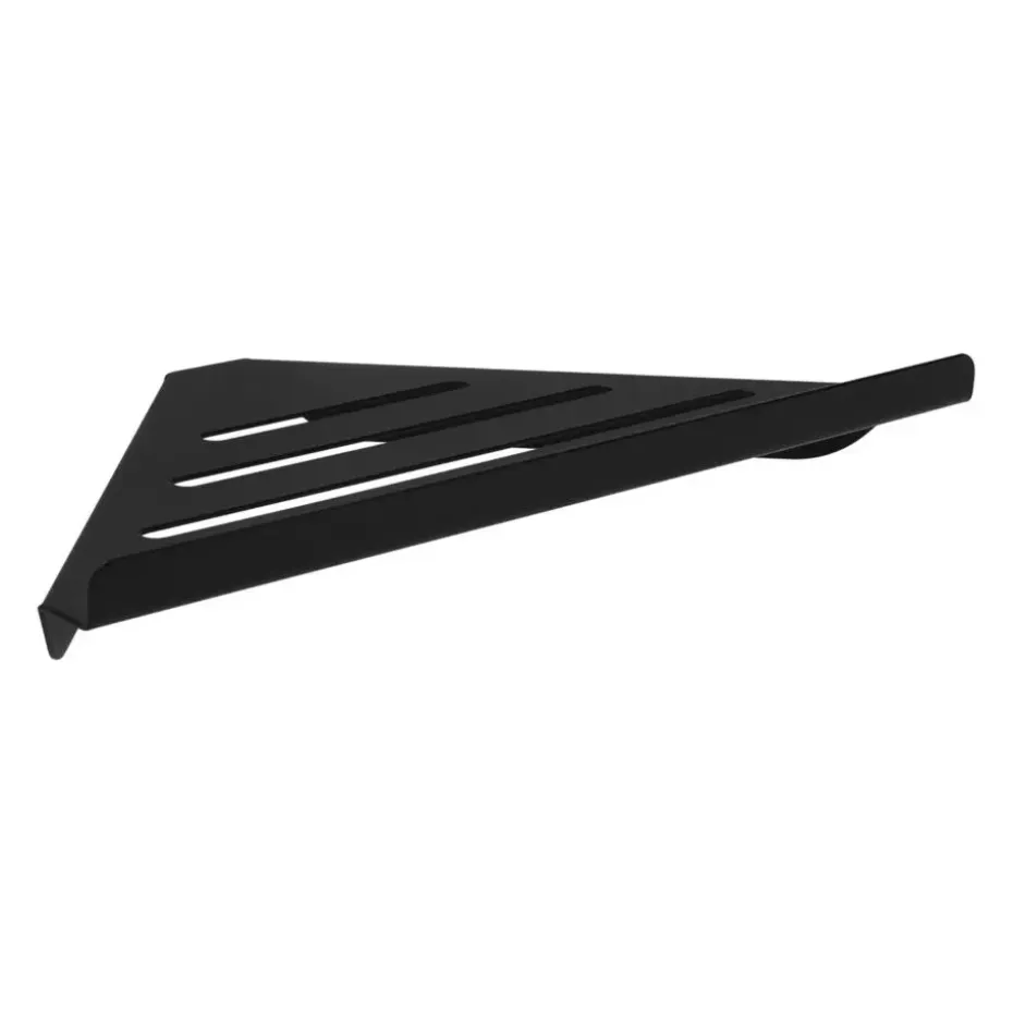 De metalen wandplank voor de hoek heeft een strak ontwerp. De wandplank is zwart van kleur, gemaakt van metaal en heeft enkele gleuven. De gleuven zorgen ervoor dat er geen water op de plank blijft staan wanneer je deze in de badkamer gebruikt. Het strakke ontwerp past goed bij een industrieel of modern interieur.