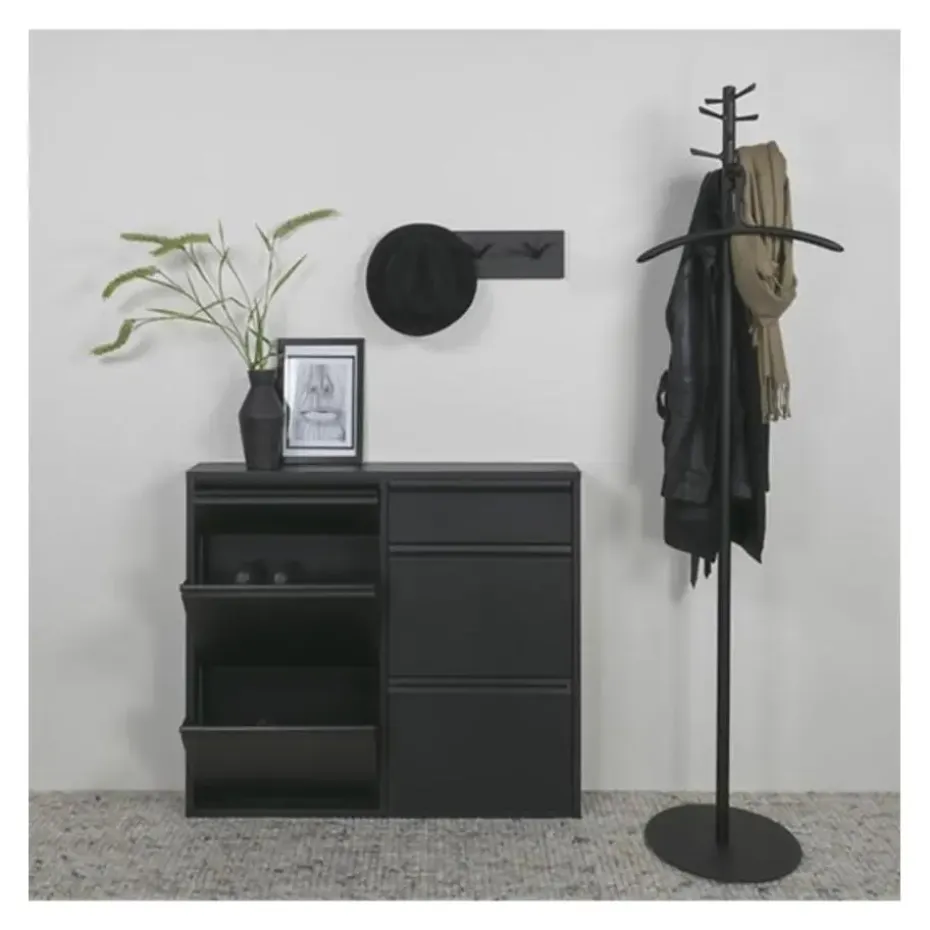 Combineer het zwart van de kast met zwarte accessoires en zwarte verlichting. Maak je contrasten tussen zwart en wit of laat je het zwart tegen een donkere achtergrond uitkomen? Het kan allemaal! Met deze kast zit je altijd goed, welke stijl je ook aan je woning geeft. Ze zal nog jarenlang je gang of hal stijlvol aankleden.
