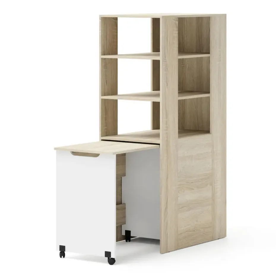 Dankzij de soepel lopende wielen schuift het bureau in een oogwenk uit, waardoor een volwaardige, ergonomische werk- of studieplek ontstaat. Wanneer de taak is voltooid, schuift het discreet onder het rek, waardoor het kantoor verandert in een nette ontspanningsruimte. Zeg vaarwel tegen rommel! Het rek biedt een reeks open planken van verschillende afmetingen. U kunt er boeken, decoraties, ordners of multimedia-apparatuur op tentoonstellen. Deze open constructie vergemakkelijkt niet alleen de toegang, maar vergroot ook de ruimte optisch, waardoor deze lichter wordt. Investeer in een meubelstuk dat voor u werkt en uw ruimte transformeert in een functioneel en stijlvol centrum van huiselijke activiteit!