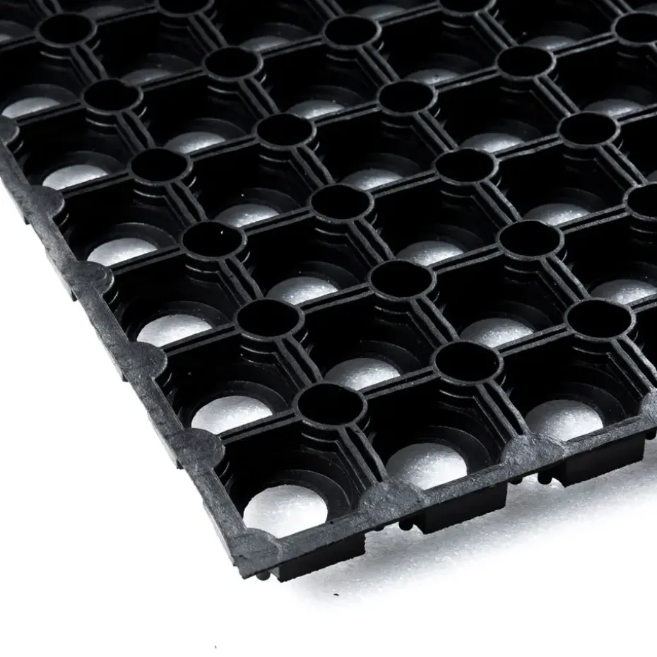 Een ringmat is zowel binnen als buiten te gebruiken. De open bodem zorgt voor een goede afvoer van vloeistoffen en vuil. Dat is niet alleen praktisch bij je entree, maar ook veilig op plaatsen waar de vloer vaak nat is. Doordat de mat van natuurlijk rubber is gemaakt, heeft deze een goede antislip werking, zelfs op koude en natte winterdagen. Tot slot heeft rubber een (geluid)dempende en isolerende werking. Schoonmaken van de ringmat kan heel gemakkelijk door deze uit te kloppen of af te spuiten met een tuinslang/hogedrukspuit.