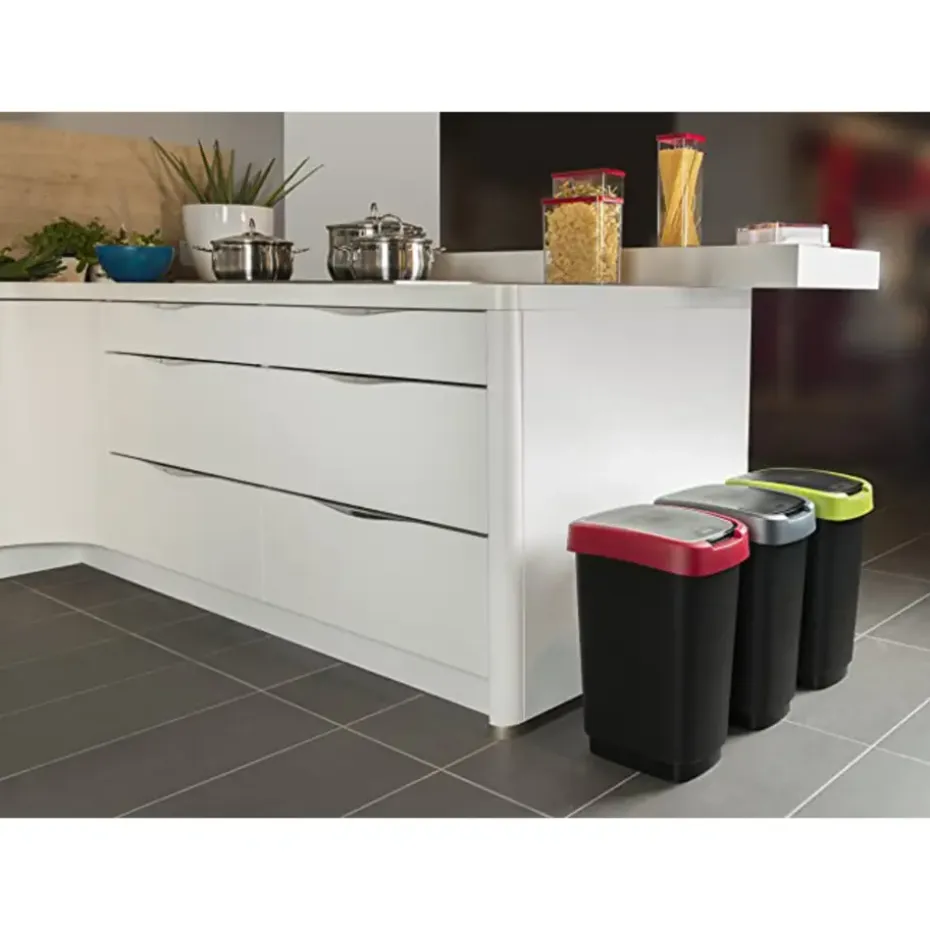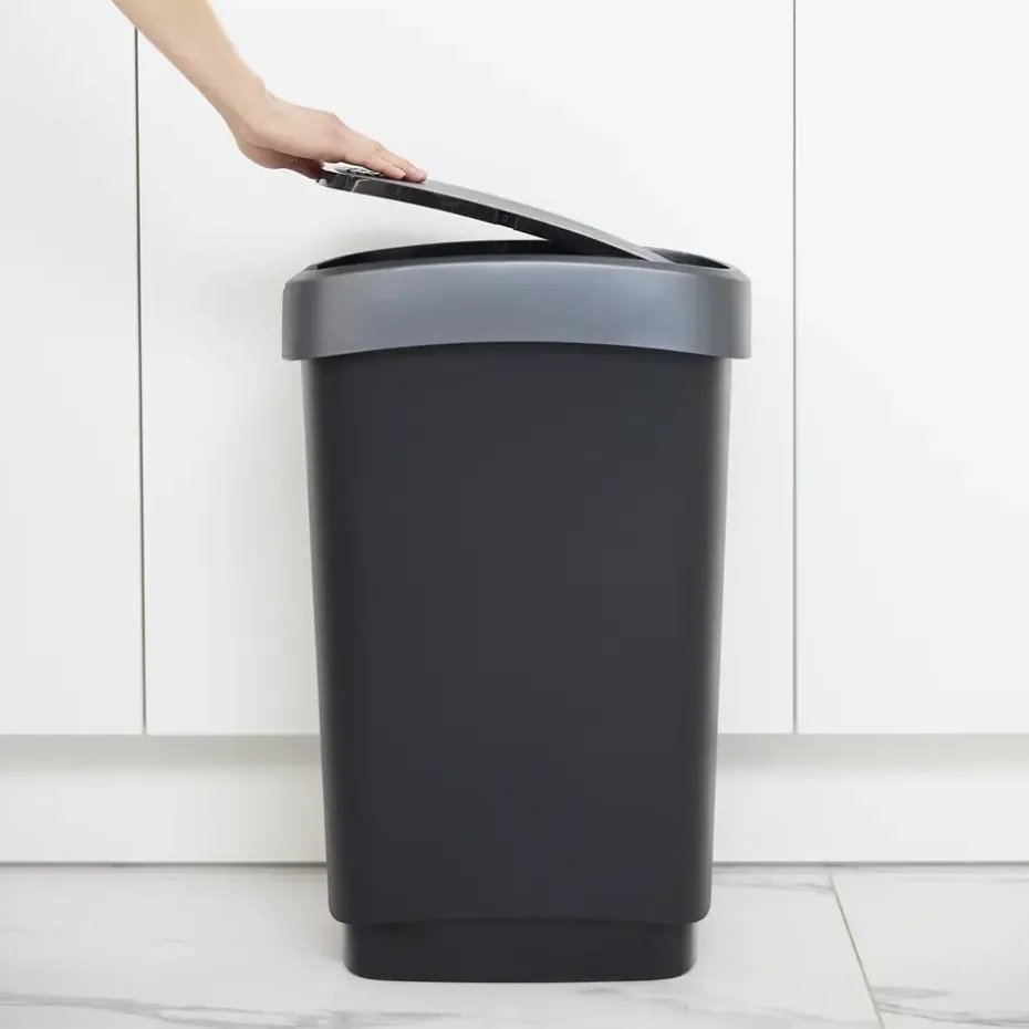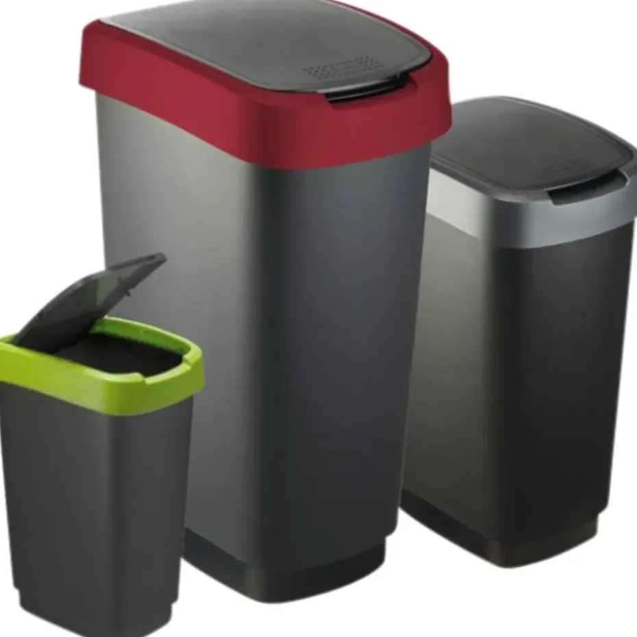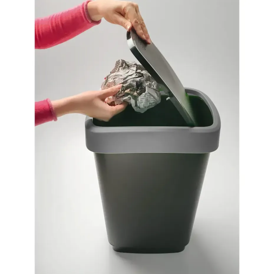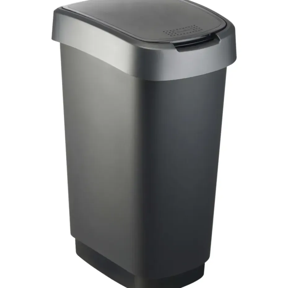 Deze rechthoekige Twist afvalbak van Rotho heeft een moderne industriële look en heeft een robuust design. De afvalbak, uitgevoerd in donkergrijs past perfect binnen iedere inrichting. Vingerafdrukken vind je niet terug op deze afvalbak en ook is hij gemakkelijk te reinigen met een doekje. Daarnaast is de afvalbak gemaakt van duurzaam kunststof en is hij voorzien van een handig kanteldeksel dat op 2 manieren te openen is. De vuilniszak is eenvoudig te bevestigen aan de bak en wordt door het deksel op de plek gehouden. De afmetingen van deze Twist afvalbak zijn 40,1 x 29,8 x 60,2 cm en de bak heeft een inhoudsmaat van 50 liter.