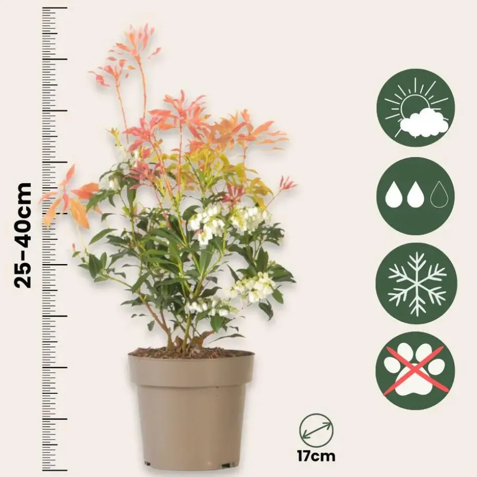 De Pieris ‘Forest Flame’ is een echte eye-catcher met zijn vuurrode jonge blad. Deze plant is ook bekend onder de naam rotsheide. Deze opvallende heester krijgt vanaf maart lange witte bloemtrossen die bijen en vlinders aantrekken. De geurende, kleine bloemen hangen als klokjes aan de plant. De Pieris ‘Forest Flame’ is winterhard en behoud het hele jaar door zijn blad, zodat je het hele jaar van de struik kunt genieten. De struik wordt maximaal 4 meter hoog en is hierdoor geschikt voor iedere tuin.