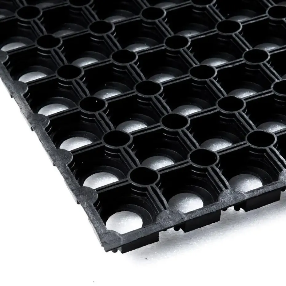Een ringmat is zowel binnen als buiten te gebruiken. De open bodem zorgt voor een goede afvoer van vloeistoffen en vuil. Dat is niet alleen praktisch bij je entree, maar ook veilig op plaatsen waar de vloer vaak nat is. Doordat de mat van natuurlijk rubber is gemaakt, heeft deze een goede antislip werking, zelfs op koude en natte winterdagen. Tot slot heeft rubber een (geluid)dempende en isolerende werking. Schoonmaken van de ringmat kan heel gemakkelijk door deze uit te kloppen of af te spuiten met een tuinslang/hogedrukspuit.