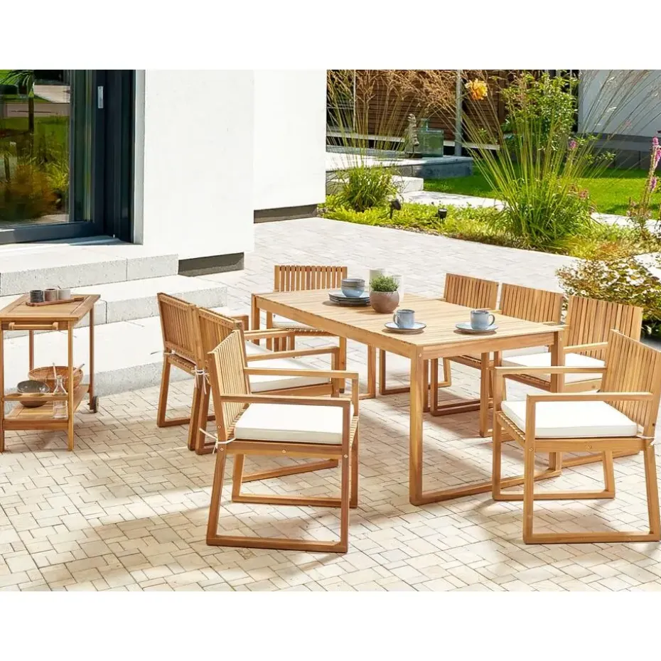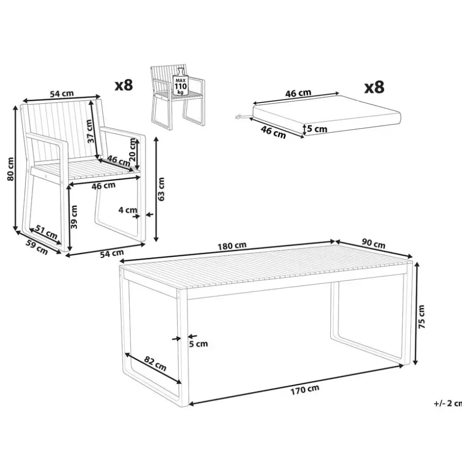 Aanbod omvat: 1 x Tafel, 8 x Stoel, 8 x Zitkussen