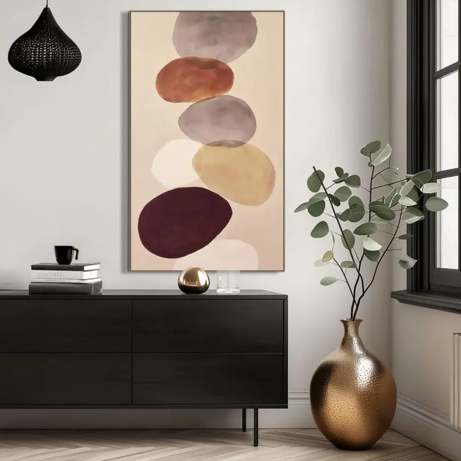 Schilderij Gekleurde Stenen FCL meet 118×70 cm en is een sfeervol wanddecoratie-element met een rustgevende uitstraling. Het kunstwerk toont licht abstract gestapelde keien in aardse tinten, wat zorgt voor een natuurlijke en harmonieuze sfeer in huis. Het schilderij is vervaardigd van FCL (Fine Canvas), een materiaal dat bekend staat om zijn lichte gewicht en strakke afwerking, waardoor het eenvoudig op te hangen is. De mooie MDF lijst rondom het werk voegt warmte toe en geeft het geheel een afgewerkte en kwalitatieve uitstraling. Dankzij het grote formaat komt het kunstwerk goed tot zijn recht boven een bank, dressoir of eettafel. De combinatie van natuurlijke kleuren en een organisch onderwerp zorgt ervoor dat dit schilderij zich makkelijk laat combineren met verschillende interieurstijlen. Als je op zoek bent naar rust, warmte en stijl aan de muur, dan is schilderij Gekleurde Stenen FCL een goede keuze.