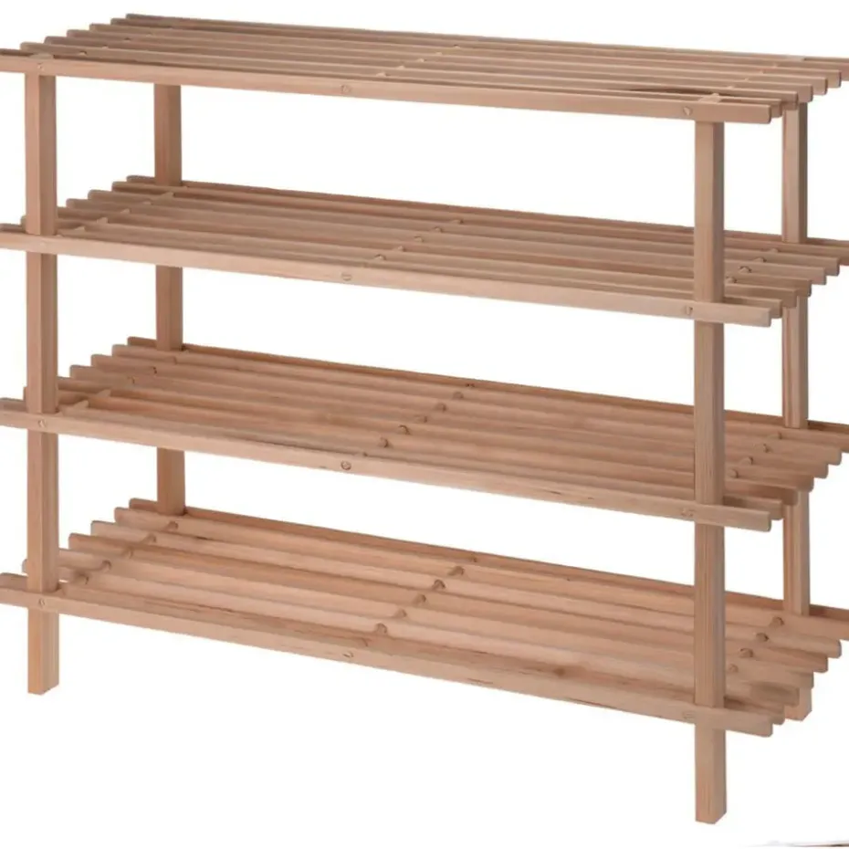 Houten schoenenrek 4-laags. Schoenenstandaard/rek met ruimte voor ca. 12 paar schoenen. Gemakkelijk in elkaar te zetten, wordt geleverd incl. gebruiksaanwijzing. Formaat: ca. 77 x 26 x 65 cm. Materiaal: hout (zilverspar).
