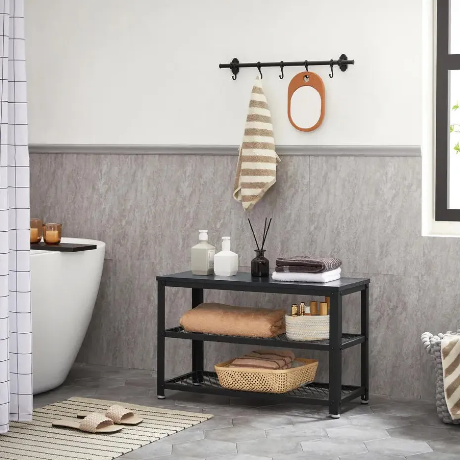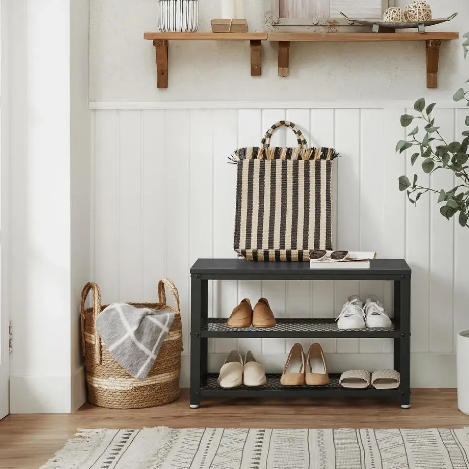 Dit opbergrek heeft 3 niveaus en neemt weinig ruimte in beslag. Het rekje biedt toch een grote capaciteit om je schoenen op te bergen en aan te trekken. De zwarte kleur van het houten blad en het metalen frame zal een strak moderne toets geven aan uw inkomhal, entree of slaapkamer.