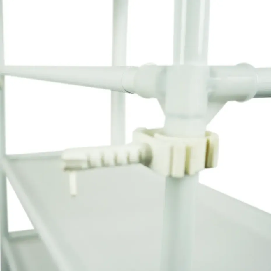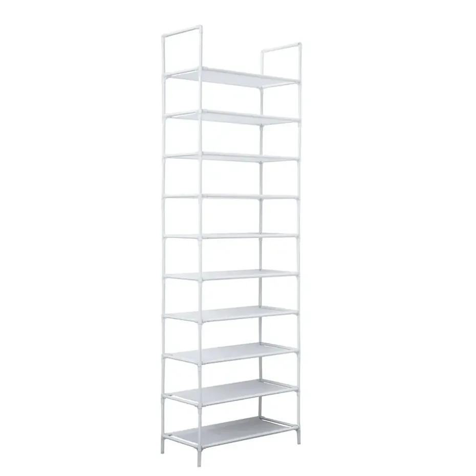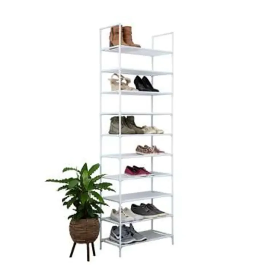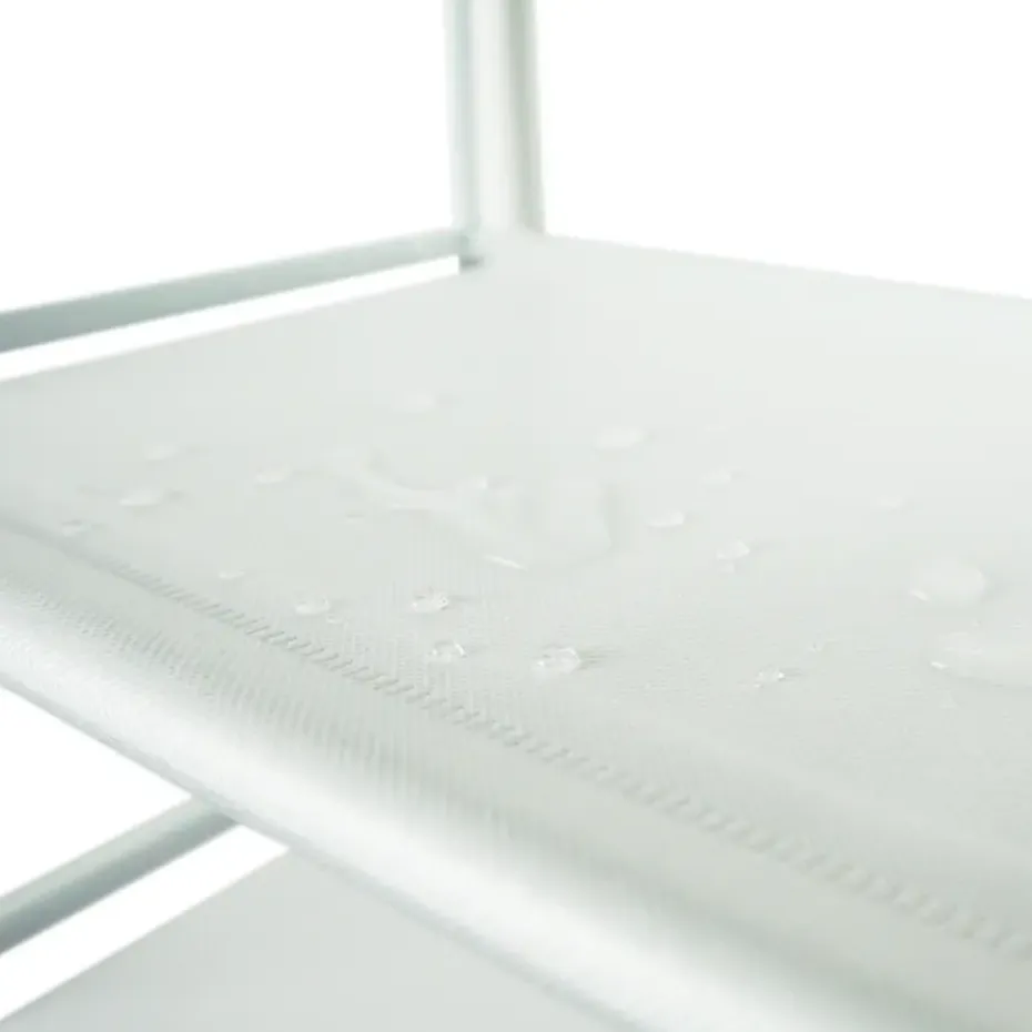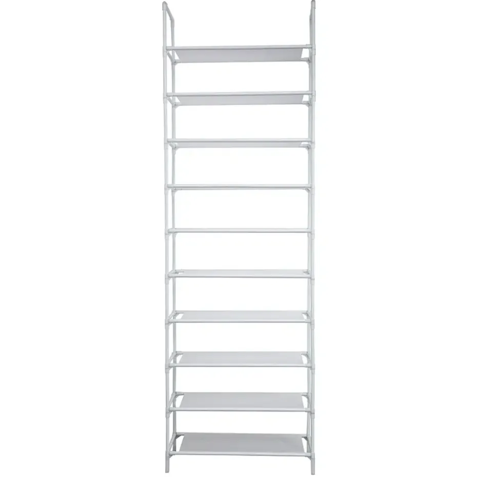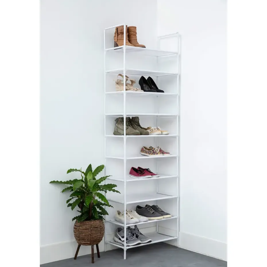 Met dit witte metalen schoenenrek geef je 20 paar schoenen een mooie plek in huis. Stevig en hoog, ideaal wanneer je veel schoenen in en kleine ruimte netjes wilt opbergen. Het vlies van de schappen is waterafstotend waardoor water van natte schoenen niet intrekt. Vuil als stof en zand veeg je bovendien gemakkelijk af met een vochtige doek. De poten zijn van kunststof zodat je geen krassen maakt op je vloer. Je zet het schoenenrek snel en makkelijk in elkaar. Het rek is verplaatsbaar, maar kan voor extra stevigheid ook met de bijgeleverde pluggen aan de muur worden bevestigd.