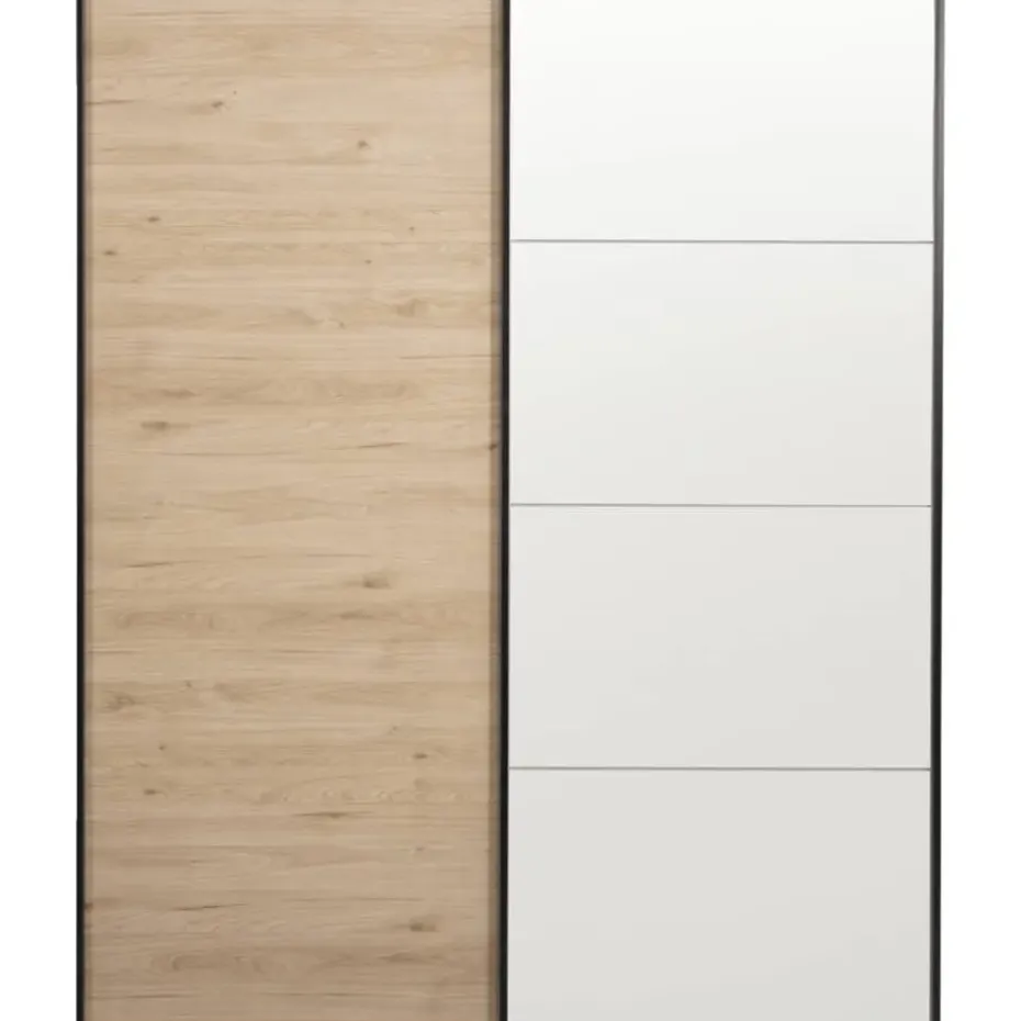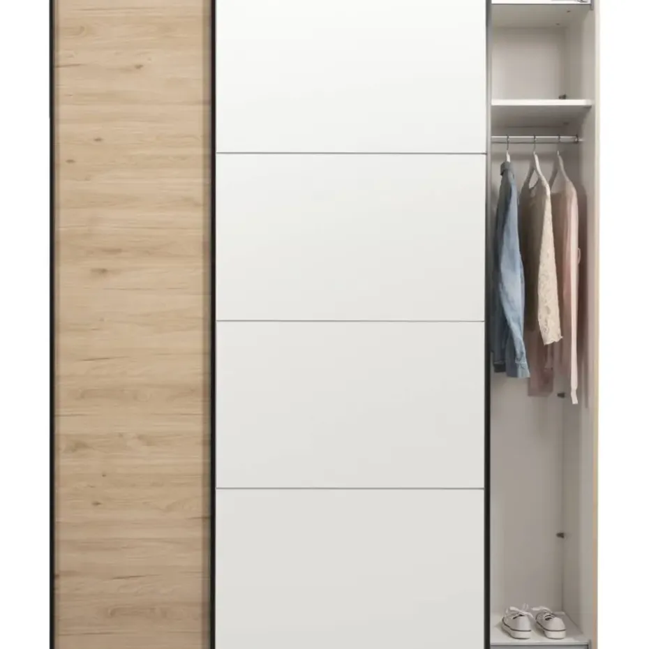 De kast beschikt over 2 legplanken en 2 roedes, wat zorgt voor een flexibele en efficiënte indeling. De legplanken bieden ruimte voor het opbergen van opgevouwen kleding, schoenen of accessoires, terwijl de roedes ideaal zijn voor het ophangen van je kleding, zoals jurken, overhemden of jassen. Hoewel de kast geen lades heeft, zorgt de slimme opbergruimte met planken en roedes ervoor dat alles netjes geordend blijft. De schuifdeuren maken de kast ideaal voor slaapkamers met beperkte ruimte, aangezien je geen extra ruimte hoeft vrij te maken voor draaideuren.