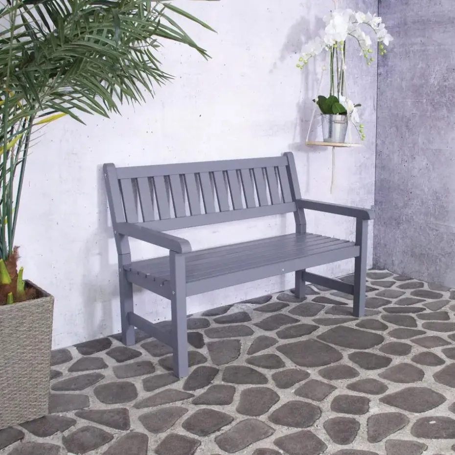 De moderne tuinbank is gemaakt van grenenhout en gebeitst in een grijze kleur. Het 100% FSC gecertificeerde hout heeft een lange levensduur. Dit bankje biedt 2 zitplaatsen voor in je (kleine) tuin, balkon of voortuin.
