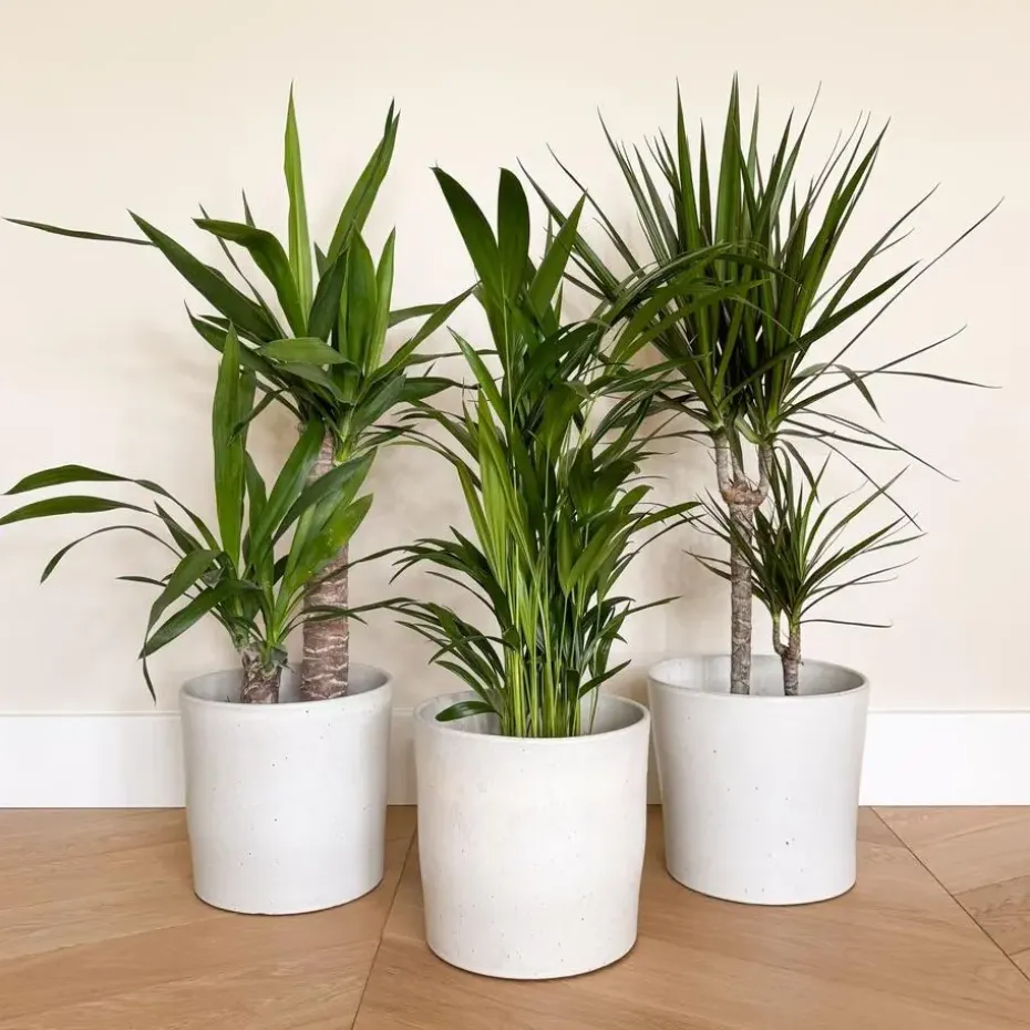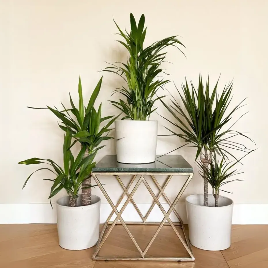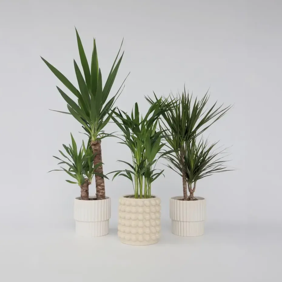 Dypsis lutescens, Dracaena Marginata en Yucca Elephantipes zijn tropische planten die goed gedijen in helder, indirect licht. Zorg voor goed doorlatende grond en vermijd overmatig water geven om wortelrot te voorkomen. Laat de grond tussen gietbeurten door licht opdrogen. Houd de luchtvochtigheid matig en vermijd tocht. Verwijder regelmatig stof van de bladeren en snoei dode of beschadigde bladeren voor een gezonde uitstraling.