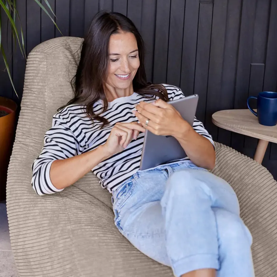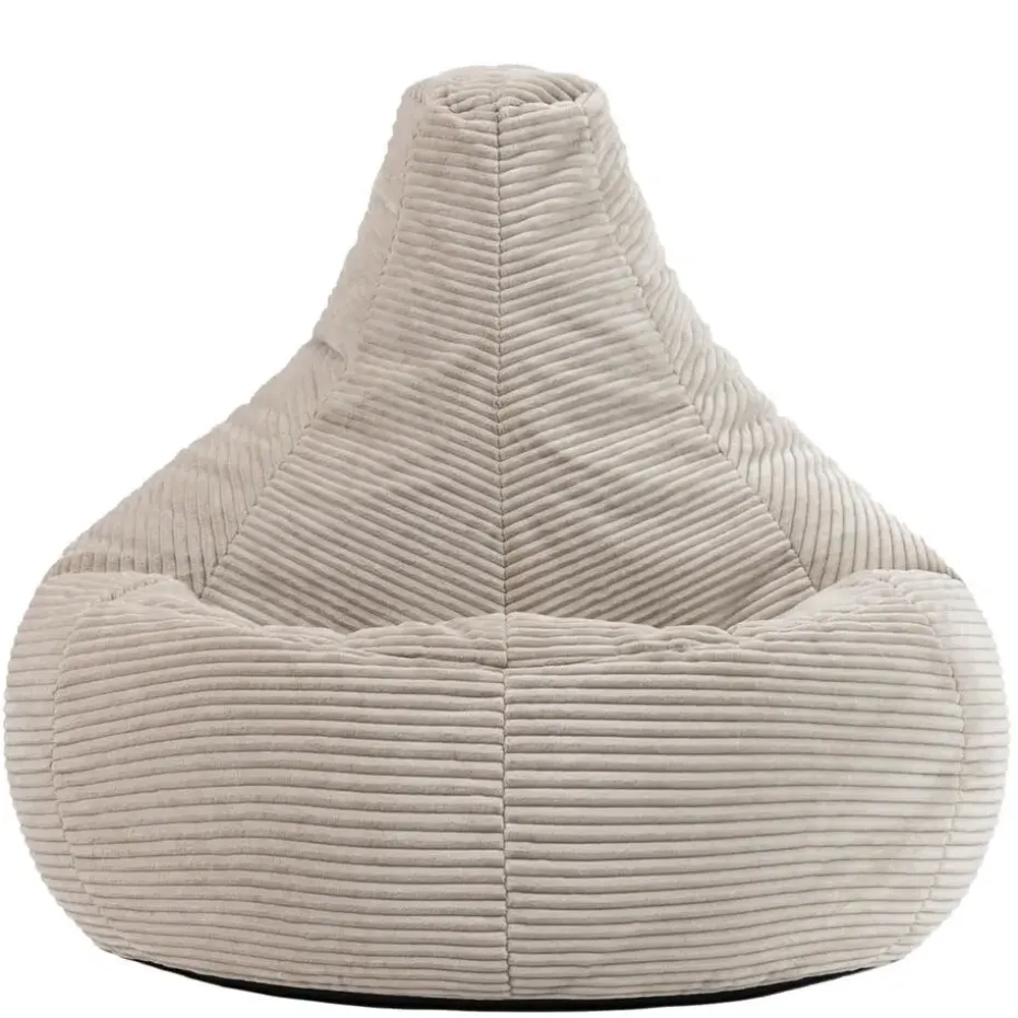 RELAX EN LEUN ACHTEROVER; Deze zitzakzetel is gemaakt om lang in te zitten, vervaardigd in super zacht corduroy en gevuld met precies de juiste hoeveelheid kralen voor een perfect ondersteunend inzakeffect.