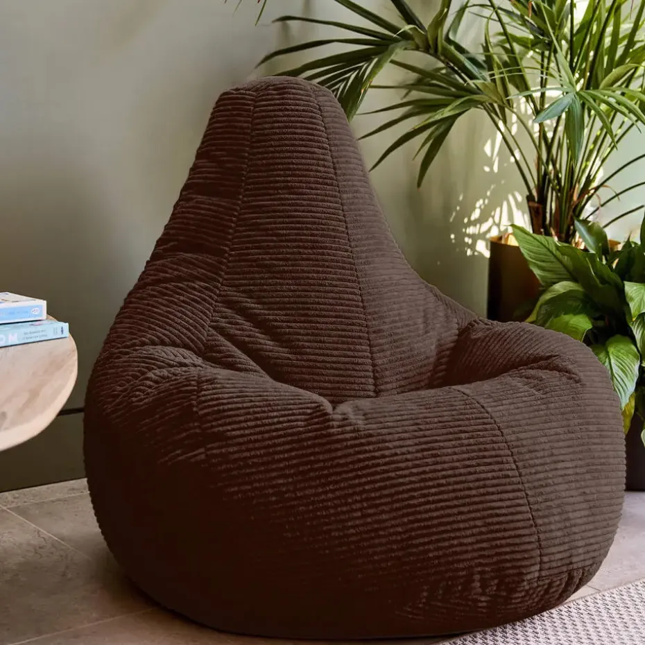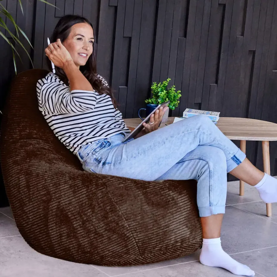 RELAX EN LEUN ACHTEROVER; Deze zitzakzetel is gemaakt om lang in te zitten, vervaardigd in super zacht corduroy en gevuld met precies de juiste hoeveelheid kralen voor een perfect ondersteunend inzakeffect.