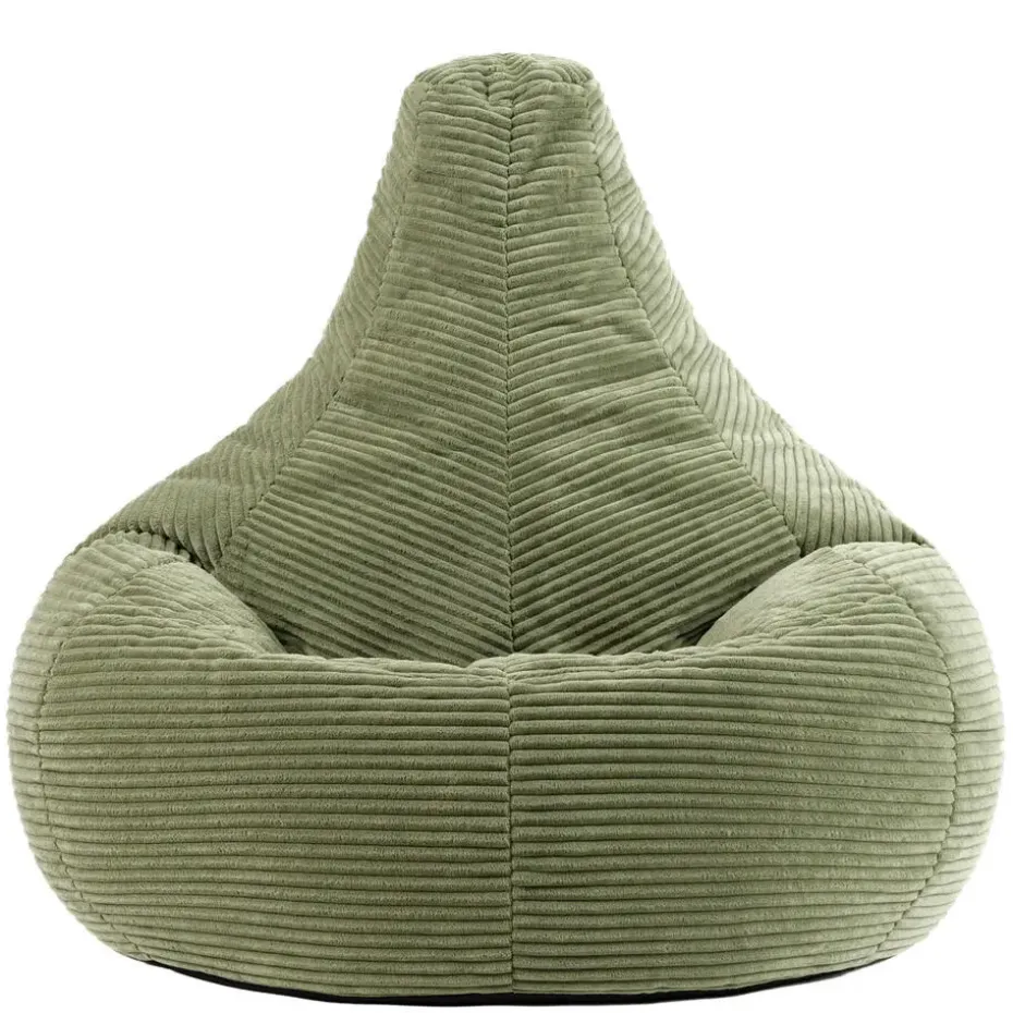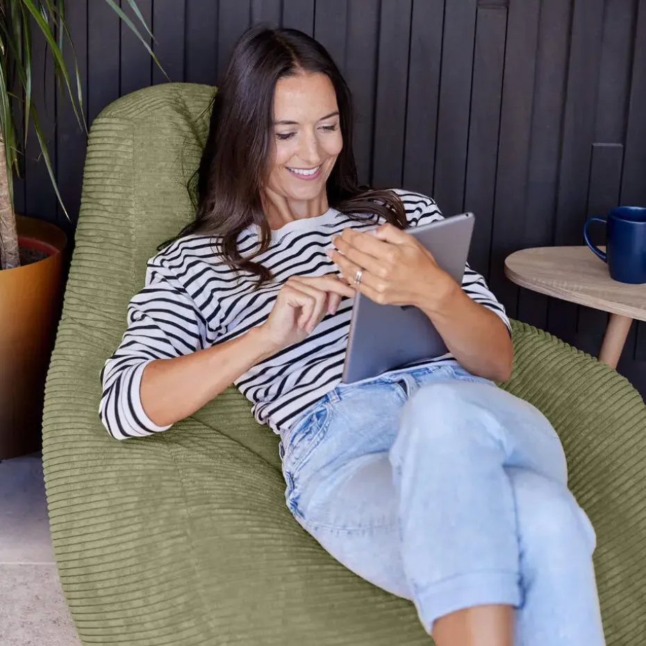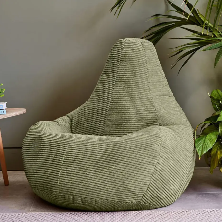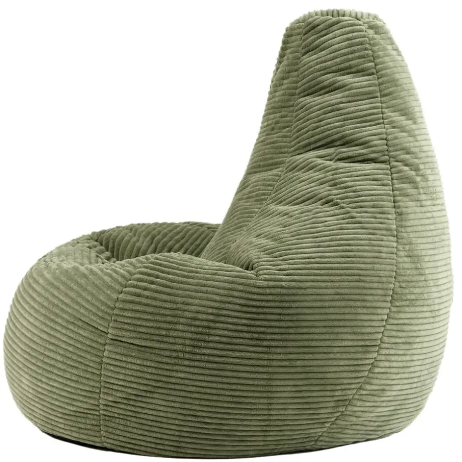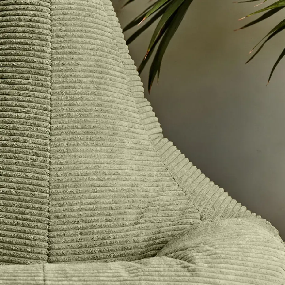RELAX EN LEUN ACHTEROVER; Deze zitzakzetel is gemaakt om lang in te zitten, vervaardigd in super zacht corduroy en gevuld met precies de juiste hoeveelheid kralen voor een perfect ondersteunend inzakeffect.