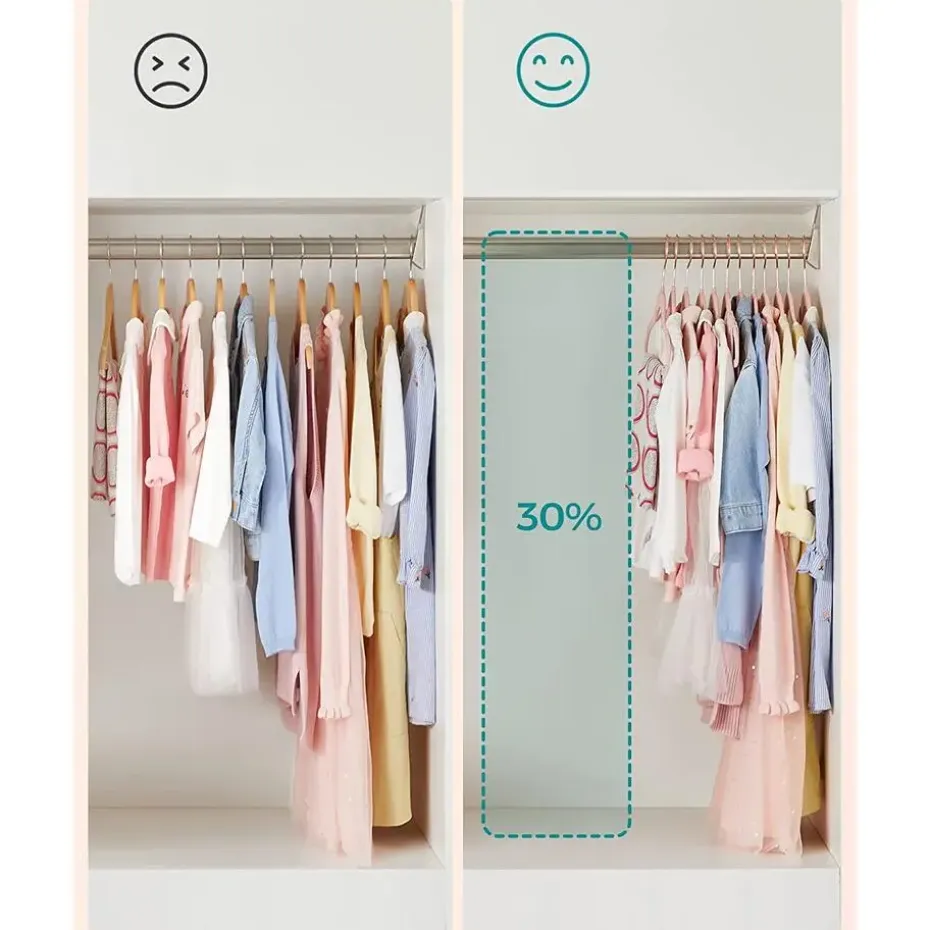 Puilt de kledingkast van je kinderen uit? Met deze 0,6 cm dunne kleerhanger heb je meer ruimte in de kledingkast voor knusse pyjama’s of schattige overalls.
