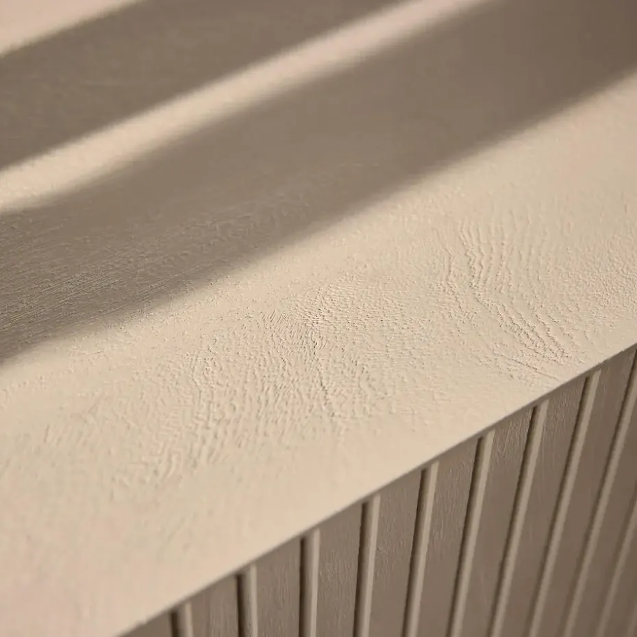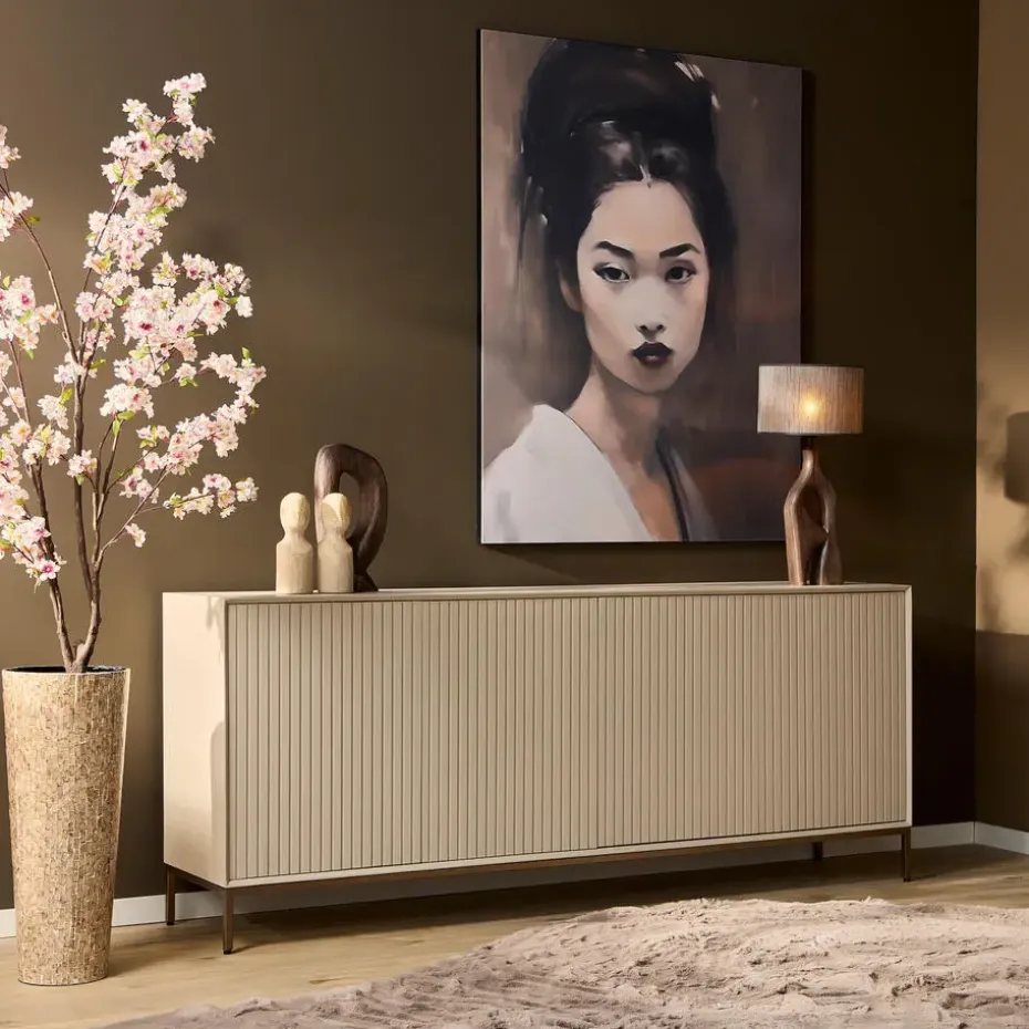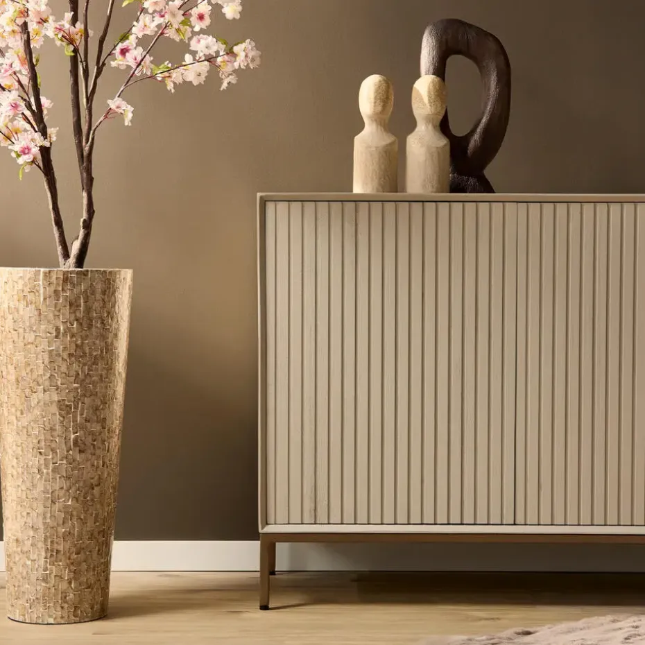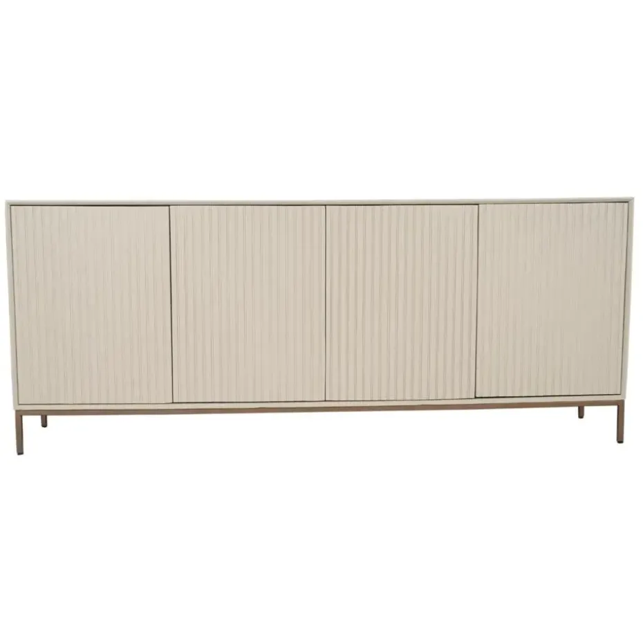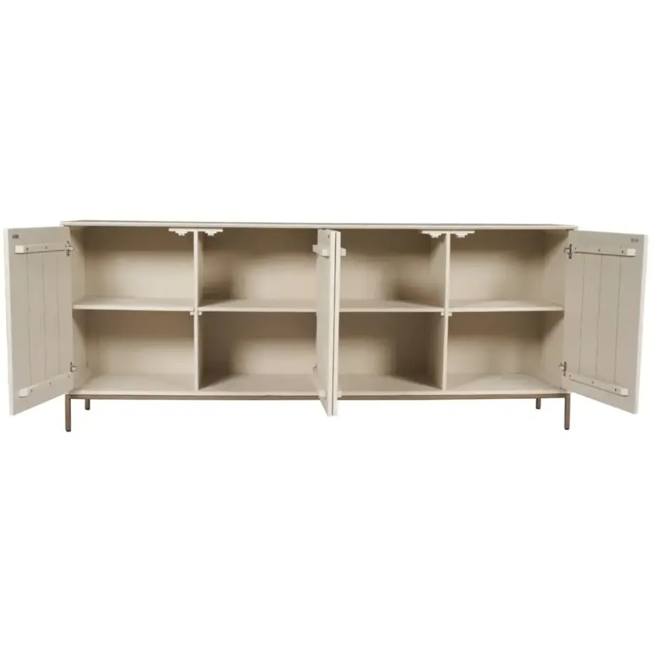 Het dressoir Madison Sand is gemaakt van licht gezandstraald mangohout en afgewerkt met een verfijnde sand finish. Het metalen frame met een bronzen finish voegt een elegant accent toe. Dit dressoir beschikt over vier deuren, elk voorzien van een stijlvol verticaal lattenpatroon, en biedt zowel een moderne als tijdloze uitstraling.