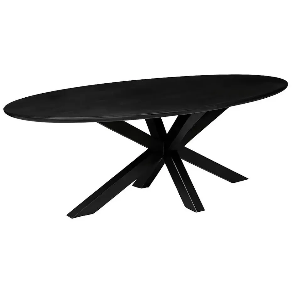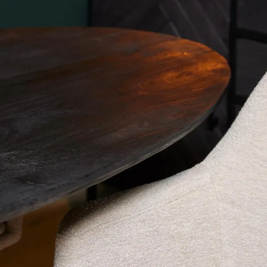 De ovale vorm van de tafel geeft een ruimtelijke indruk en maakt het een ideale keuze voor elk type woonkamer. Het mangohouten blad is gezandstraald en behandeld met een zwarte lak, wat het een tijdloze en chique uitstraling geeft.