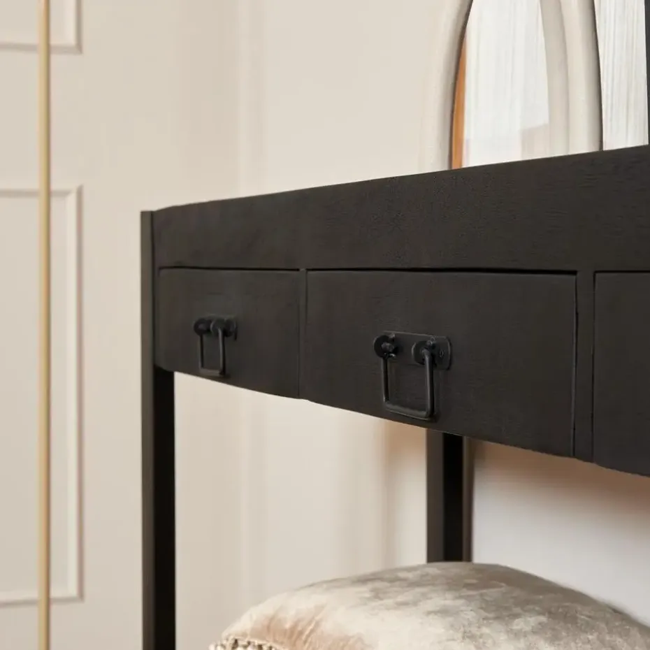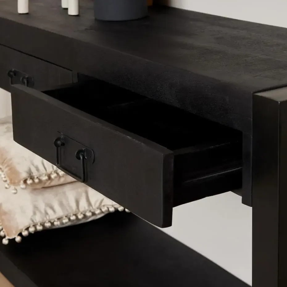 Het zwarte tafelblad is gelakt, wat zorgt voor een strakke en moderne uitstraling. De combinatie van hoogwaardig mangohout en het zwarte lakwerk geeft deze sidetable een unieke en stijlvolle look.