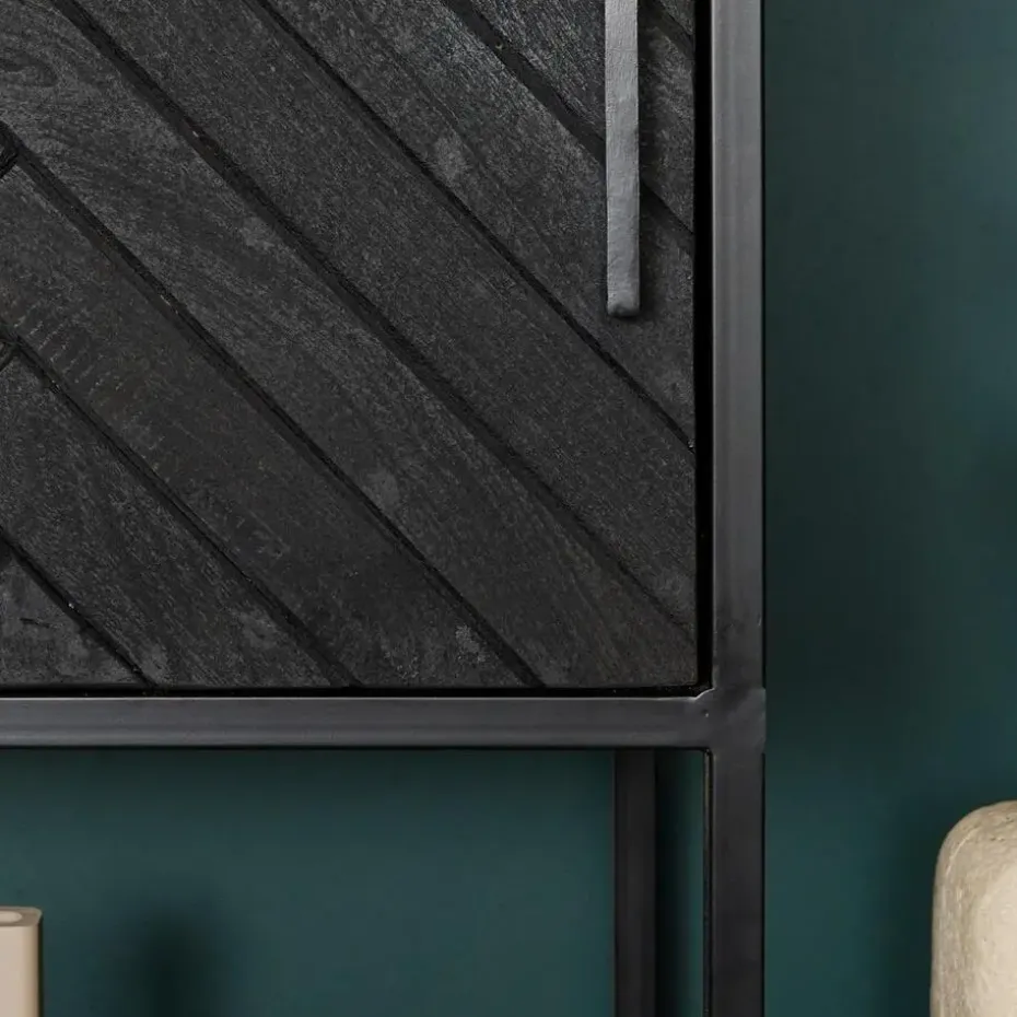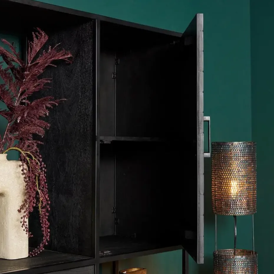 Deze vakkenkast is vervaardigd met een mooie afwerking van gezandstraald hout en een zwarte lak, wat resulteert in een tijdloze en moderne uitstraling. Het mangohout en metaal zorgen voor een robuuste constructie die lang mee zal gaan.