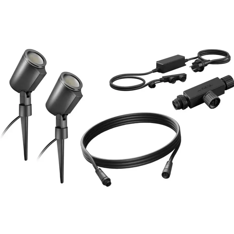 • Spot Garden starterset (5-delig): 2x grondspot 089351, 2,5m verbindingskabel 089283, 35W voeding 089252, T-verbindingsstuk (089306)