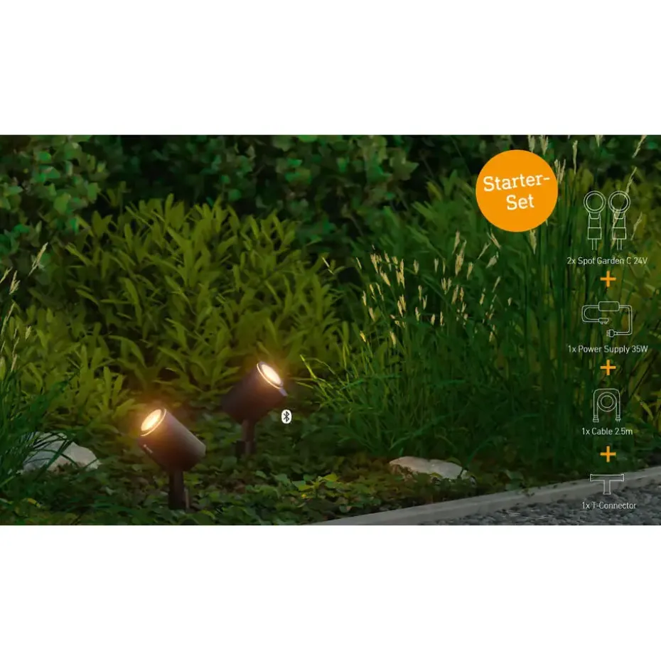 Met het innovatieve 24V Steinel verlichtingssysteem kun je jouw buitenruimte laten stralen als nooit tevoren. Het systeem maakt het mogelijk om eenvoudig lampen, kabels en voeding met elkaar te verbinden. Dit 5-delige starterspakket bestaat uit twee grondspots , 35W-voeding, 2,5 m verbindingskabel en een T-verbindingstuk. De set communiceert feilloos met de STEINEL Connect-app.