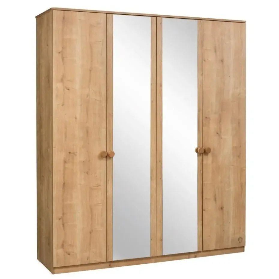 Deze kledingkast uit de Stockholm tienerkamer is een ruime en elegante opbergoplossing voor de kinderkamer. Met vier deuren, twee grote spiegels en een hoogwaardige houtlook afwerking past de kast perfect in elke slaapkamer. Dankzij het soft close systeem sluiten de deuren geruisloos en veilig. De kast biedt volop opbergmogelijkheden met zowel een hang- als een leggedeelte.