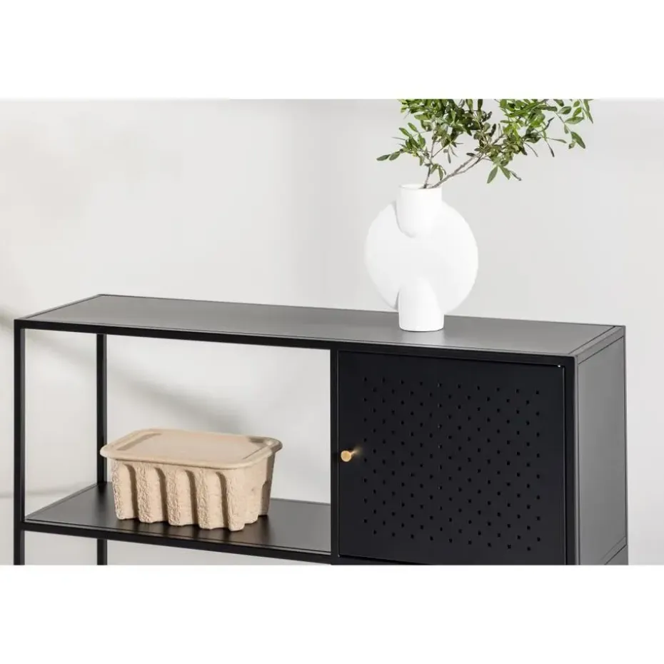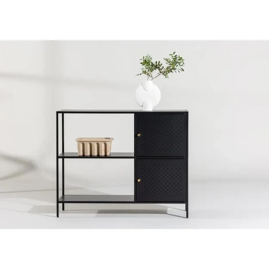 De Camilla wandkast is 100 centimeter breed en 75 centimeter hoog, uitgevoerd in zwart staal. Dit meubelstuk combineert praktische opslag met een elegant design dat moeiteloos in elk interieur past.