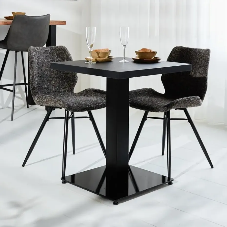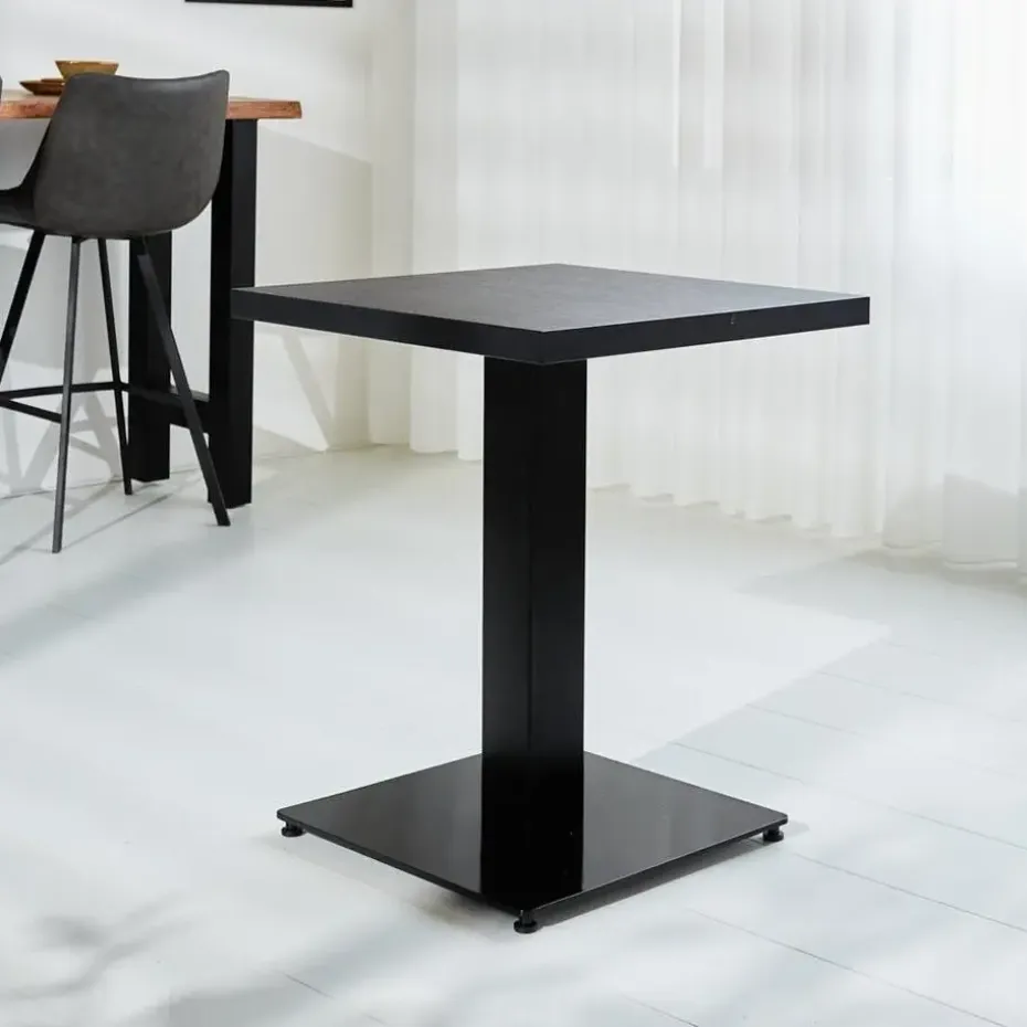 Bistrotafel Robin is een kleine eettafel gemaakt vanmelamine en metaal. Melamine is een heel sterk en waterdicht materiaal. Het materiaal bestaat uit een kunststof toplaag, geperst op spaanderplaat en afgewerkt met een ABS stootrand. Hierdoor krijgt de bistrotafel een krasvrij en slijtvast blad. Deze bistrotafel komt uitstekend tot zijn recht in kleinere eetkamers, studentenkamers of horecagelegenheden. Maar ook in bijvoorbeeld een sportkantine. Het blad is 3,8 cm centimeter dik, massief en zwart afgewerkt.