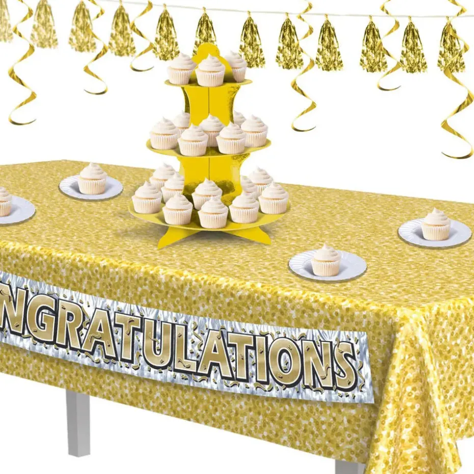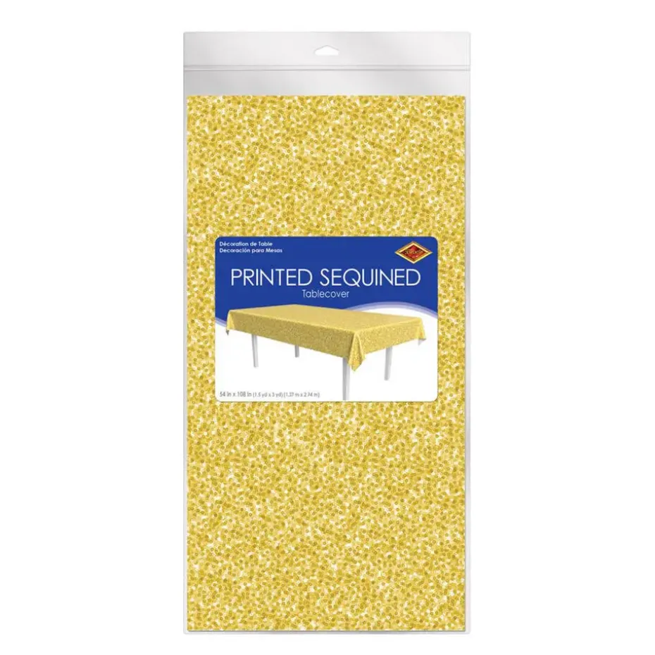 Tafellaken/tafelkleed goud met bedrukte pailletten 137 x 274 cm kunststof gouden thema party. Versier de tafel met dit mooie gouden kleed. Leuk voor een kinderfeestje of themafeestje. Materiaal: kunststof. Afmeting: ca. 137 x 274 cm. Makkelijk schoon te maken met een vochtige doek of een sopje.