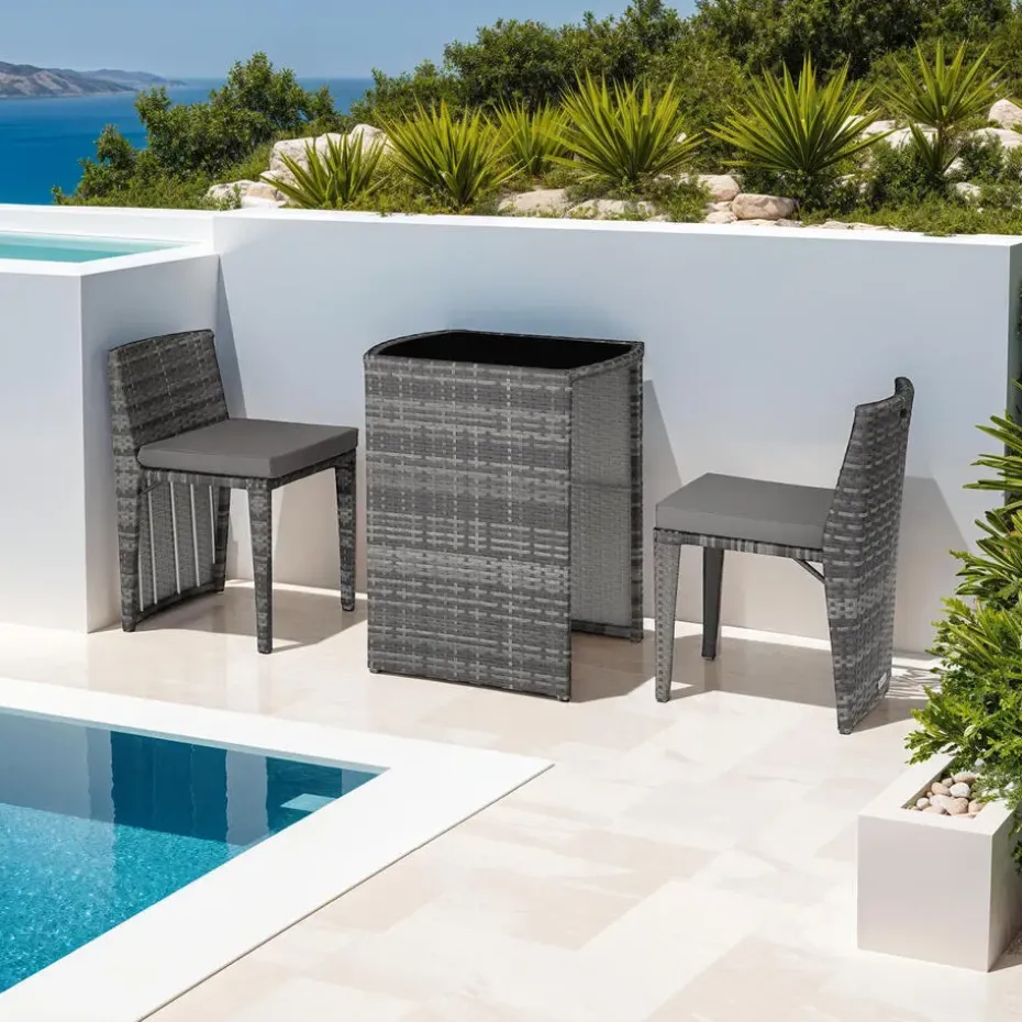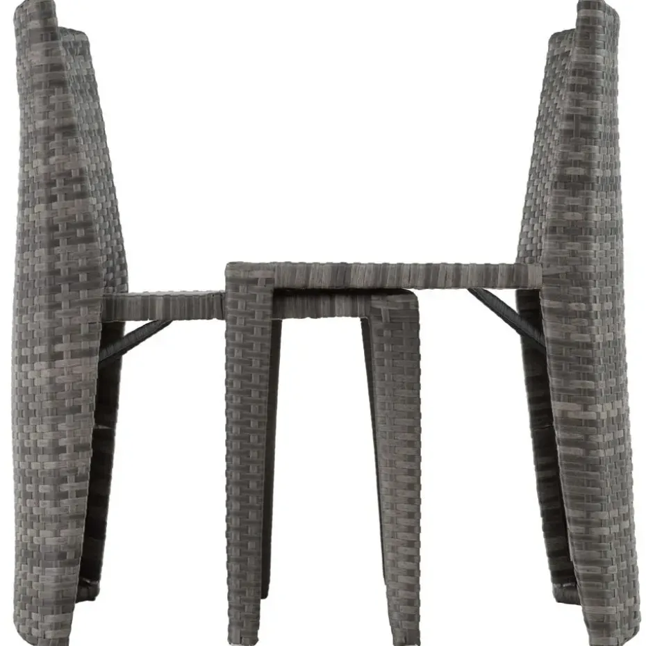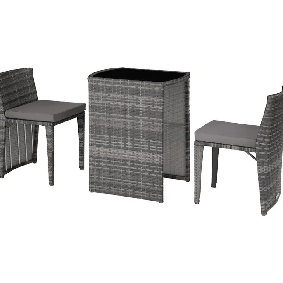 Deze sierlijke wickerset is ideaal geschikt voor hapjes en drankjes, om lekker te ontspannen en voor gezellige gesprekken in de buitenlucht. De tafel en de beide stoelen met de comfortabele en waterafstotende zitkussens worden klaar gemonteerd geleverd. Bij niet-gebruik kan de geraffineerde wickergroep plaatsbesparend samengeschoven worden. Het fijne vlechtwerk van duurzaam wicker en het stabiele frame van aluminium maken deze roestvrije set tot de perfecte buitenset. Klein, licht en knus: de uitnodigende wickerset combineert doordacht ontwerp met veel gezelligheid. Let op: Montage vereist