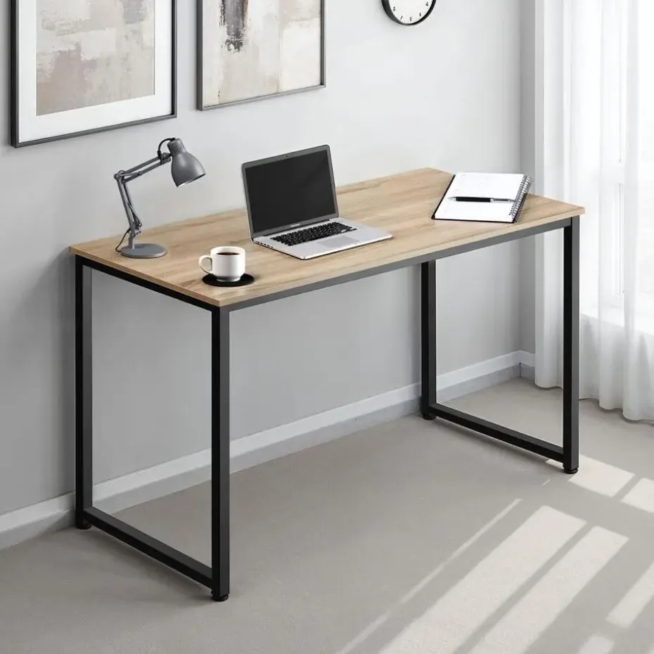 Creëer met het moderne bureau Flint de beste voorwaarden voor succesvol en efficiënt werken. Het veerkrachtige werkblad in warme houtlook wordt ondersteund door een gepoedercoat stalen frame in koel zwart. De fijne nerf geeft het verder sobere kantoormeubilair in industriële stijl net dat beetje extra. Vier schroefpoten garanderen altijd een hoge mate van stabiliteit, ook als de vloer niet altijd even vlak is. Met dit hippe bureau Flint kun je je goed focussen op je werk – thuis of op kantoor. Let op: Montage vereist