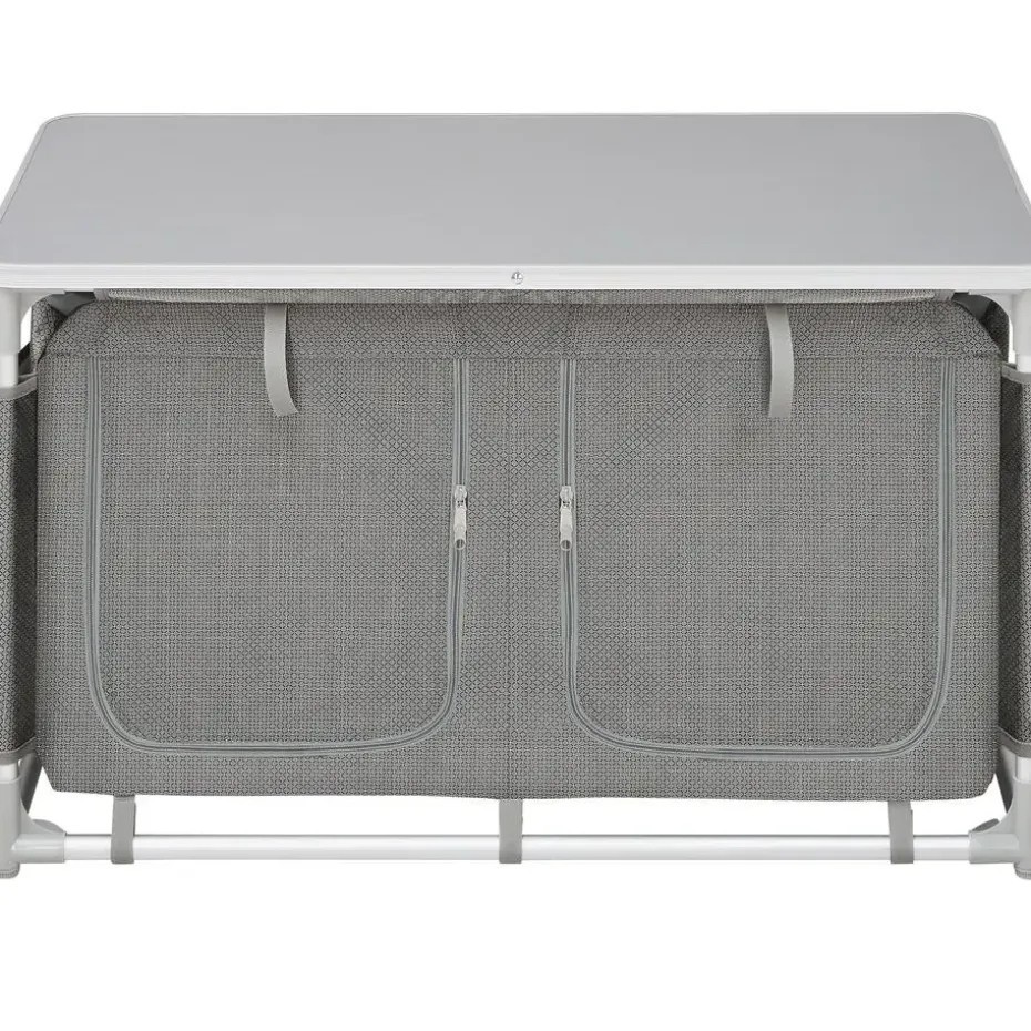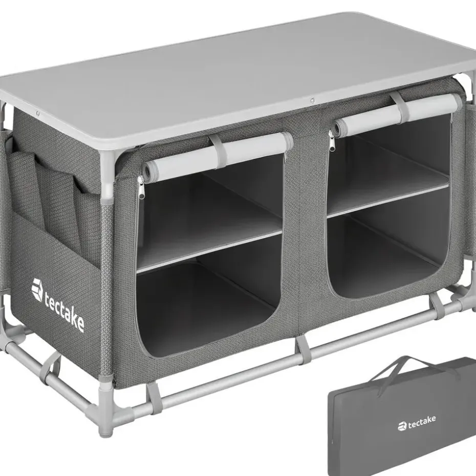 De stabiele campingkast van tectake is een klein ruimtewonder. Het ruim bemeten werkblad en de vier opbergvakken met aluminiumversterkte binnenplaten en luchtdoorlatend gaas bieden ruim plaats voor keukenspullen. Kleinere voorwerpen kunnen in het driedelige zijvak van de lage opbergkast opgeborgen worden. Oneffenheden in de ondergrond zijn voor de vier apart in de hoogte verstelbare voetjes van de campingkast geen probleem. Eenvoudig op te zetten, compact te verpakken: de demonteerbare campingkeukien van tectake is voor elke gebruik in open lucht perfect geschikt.