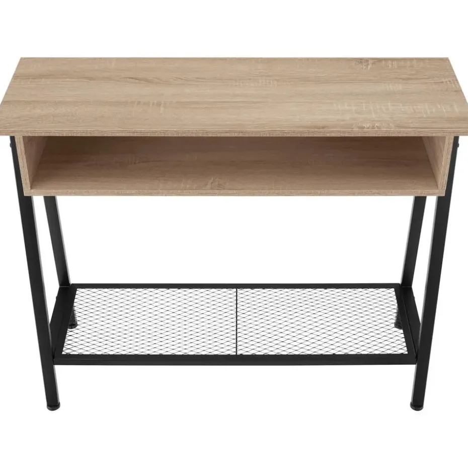 Met de minimalistische consoletafel Tralee vind het industriële charme intrede in je inrichting. Naast de hoekige vormgeving heeft de tafel typische contrasten die ontstaan door de combinatie van hard, koel staal en uitnodigend, warm hout. De rustieke roosterplank in het onderste gedeelte versterkt de ruwe fabriekslook en geeft de onderhoudsvriendelijke constructie naast de grote opbergruimte en het brede opbergvak veel stevigheid. Een aantrekkelijk detail zijn de trapeziumvormige poten die samen met de in hoogte verstelbare pootjes van vloervriendelijke kunststof voor een hoge stabiliteit zorgen. Let op: Montage vereist