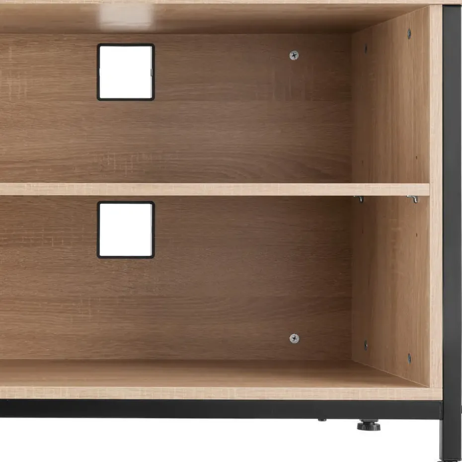 Haal de minimalistische, industriële stijl in huis met het rustieke tv-meubel Navan van tectake. Dit meubel is perfect geschikt voor presentatie van je apparaten en daarbij biedt het veel opbergruimte. De look wordt gekenmerkt door rechte lijnen en het harmonieuze contrast van warm hout en koel staal. Dankzij de twee in hoogte verstelbare planken kan de grootte van de opbergvakken worden ingesteld volgens persoonlijke voorkeuren en behoeften. Vier uitsparingen voor een nette kabelgeleiding en vier vloerbeschermende schroefpoten ronden het profiel van dit functionele en veelzijdige tv-meubel succesvol af. Let op: Montage vereist