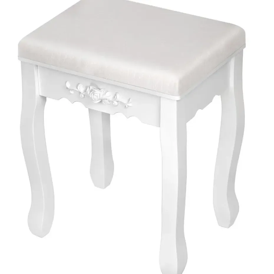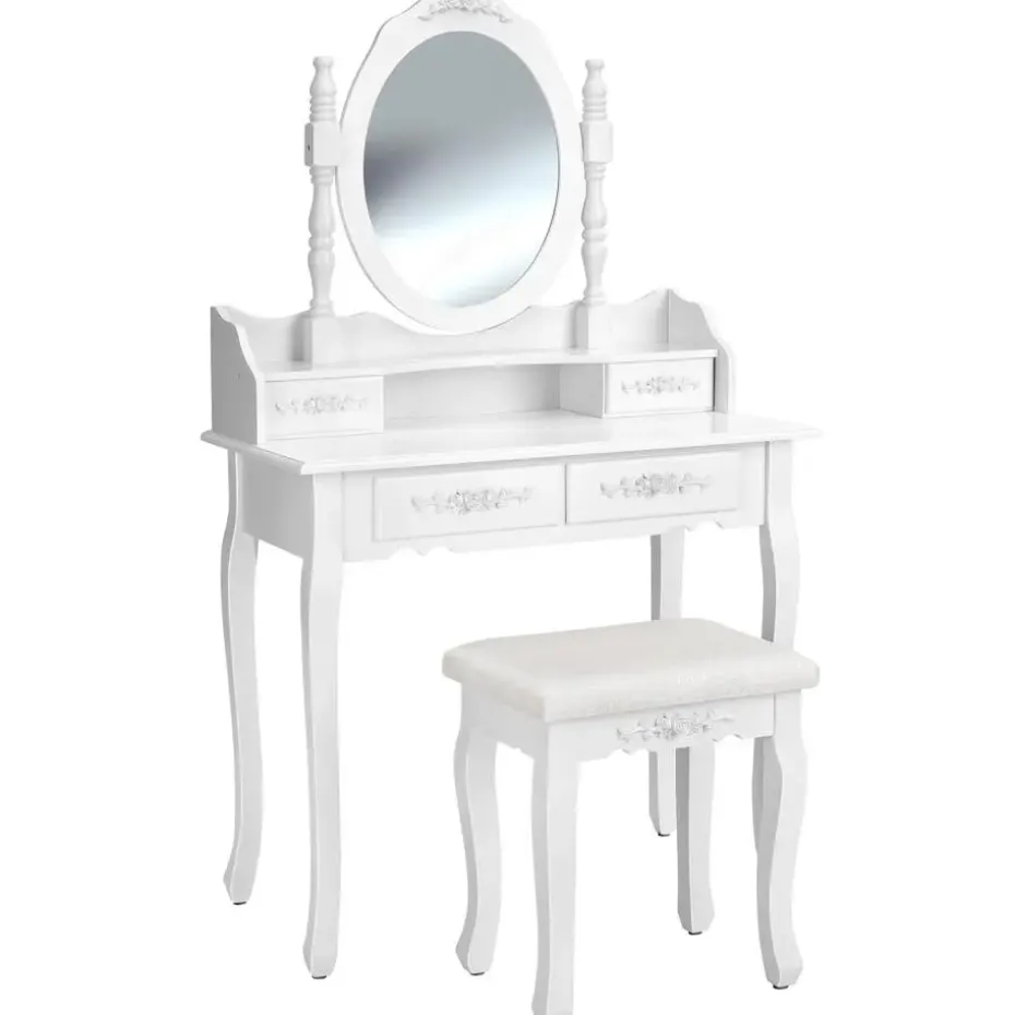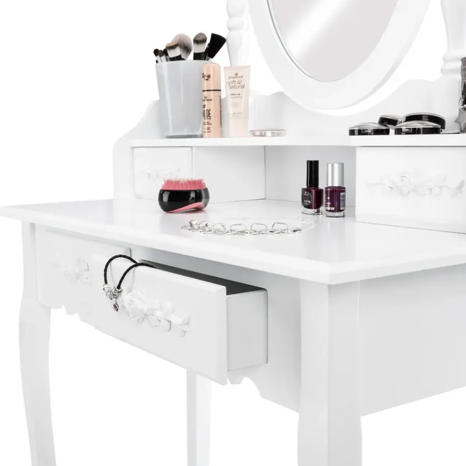 Deze elegante makeup-tafel is een echte aanwinst en kan op verschillende manieren worden gebruikt: als commode, als slaapkamertafel of voor het verzorgen van je makeup en kapsel. De vier ruime lades bieden extra ruimte voor al je sieraden en accessoires. De lades en de comfortabele zachte kruk zijn versierd met prachtige opvallende rozen. De afneembare draaiende ovalen spiegel maakt deze prachtige tafel compleet. De witte lakafwerking op de tafel en het krukje maakt één geheel van dit vlekkeloze duo.