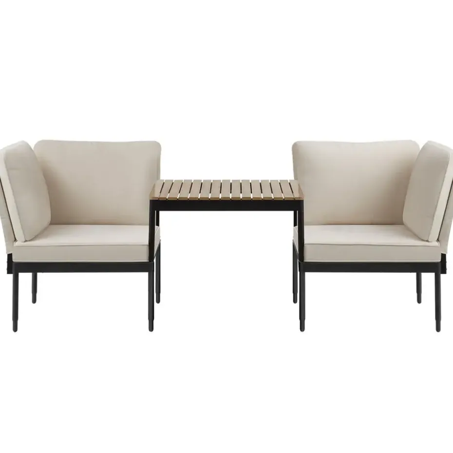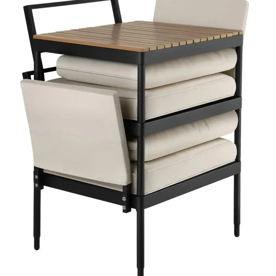De beide fauteuils beschikken elk over een armleuning met zijvak, perfect voor het opbergen van boeken of snacks. De set wordt aangevuld met een functionele tafel, die in twee verschillende hoogtes tussen de zitmeubels kan worden geplaatst. In de lage positie ontstaat een doorlopend oppervlak, dat met het derde kussen als ligstoel kan worden gebruikt.