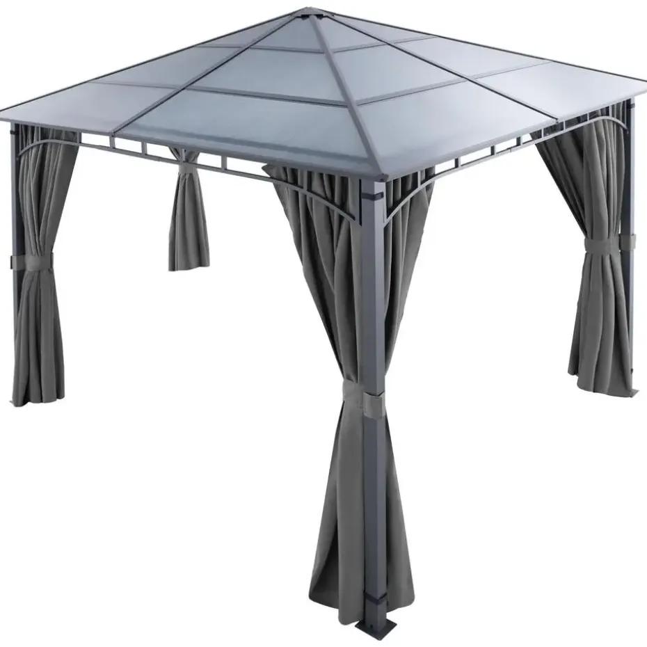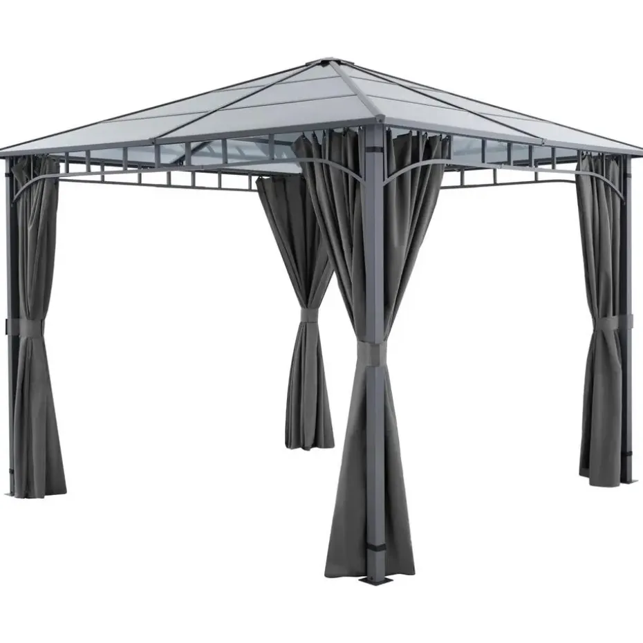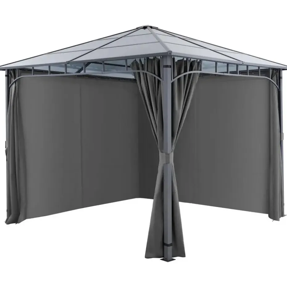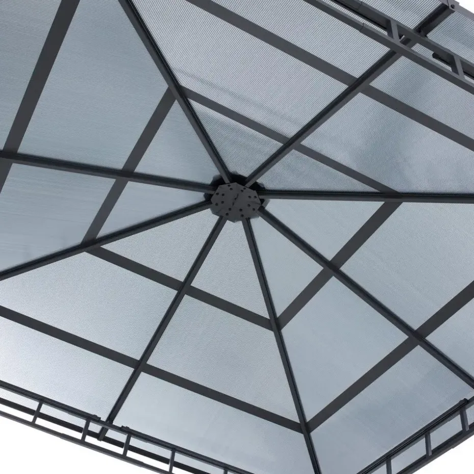 Het robuuste aluminiumframe, dat is voorzien van een hoogwaardige poedercoating en elegante versieringen, geeft de paviljoen niet alleen een hoge weerstand, maar ook een edele uitstraling die zich harmonieus in elke omgeving voegt. De in het midden van het frame geïntegreerde bevestigingsring biedt bovendien de mogelijkheid om verlichting of decoratie aan te brengen, om de avonduren in jouw tuin sfeervol te maken.