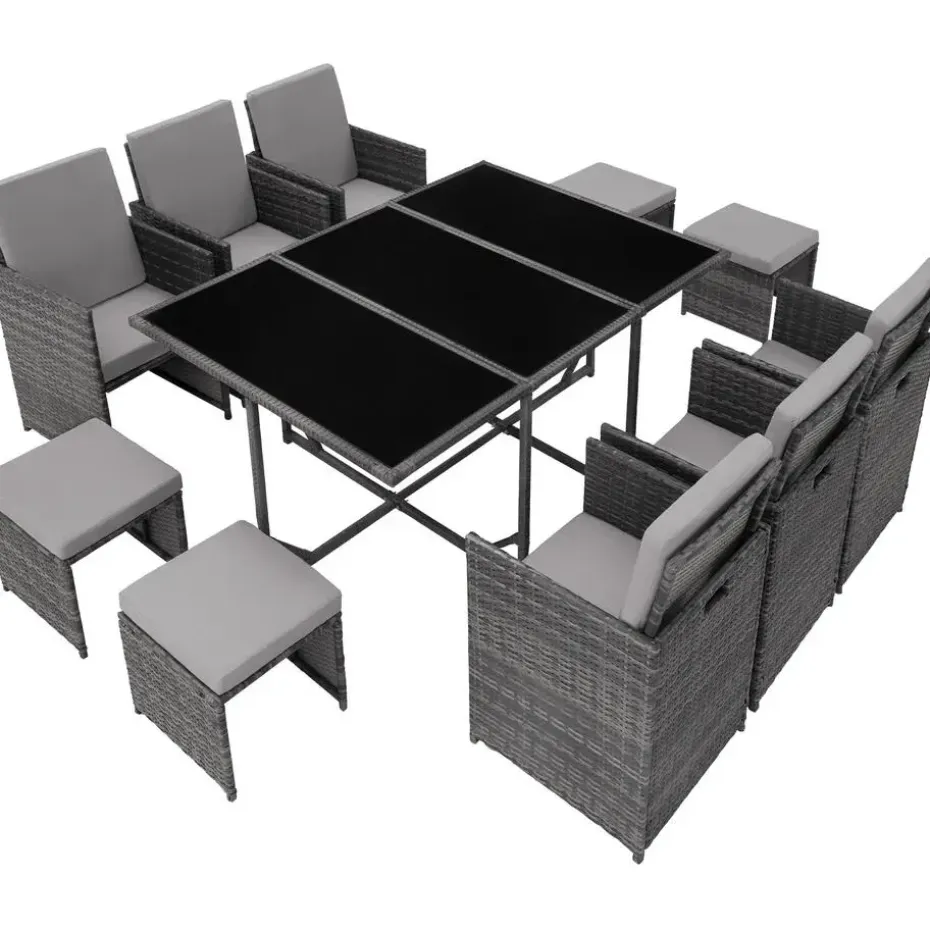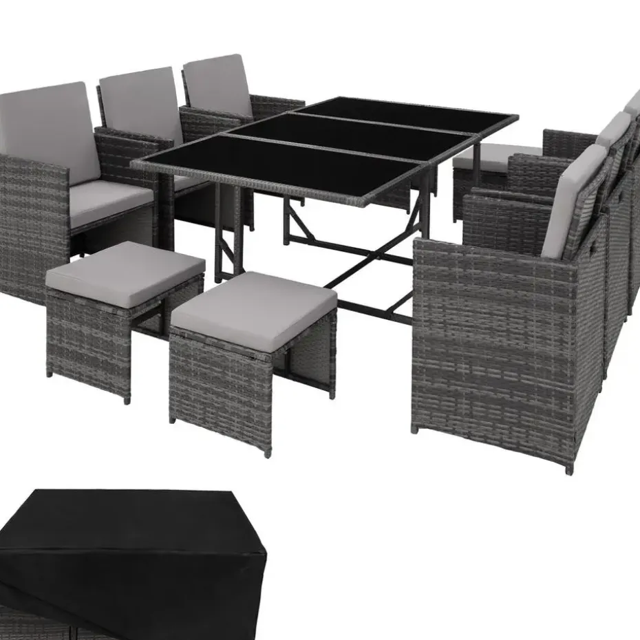 - Materiaal: zitgroep uit Polyethyleen, stalen gestel, roestvrijstalen schroeven, hoezen en kussens uit 100 % polyester