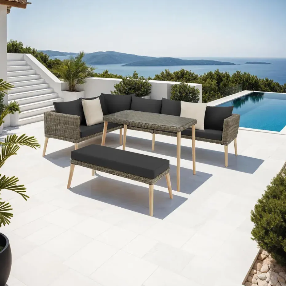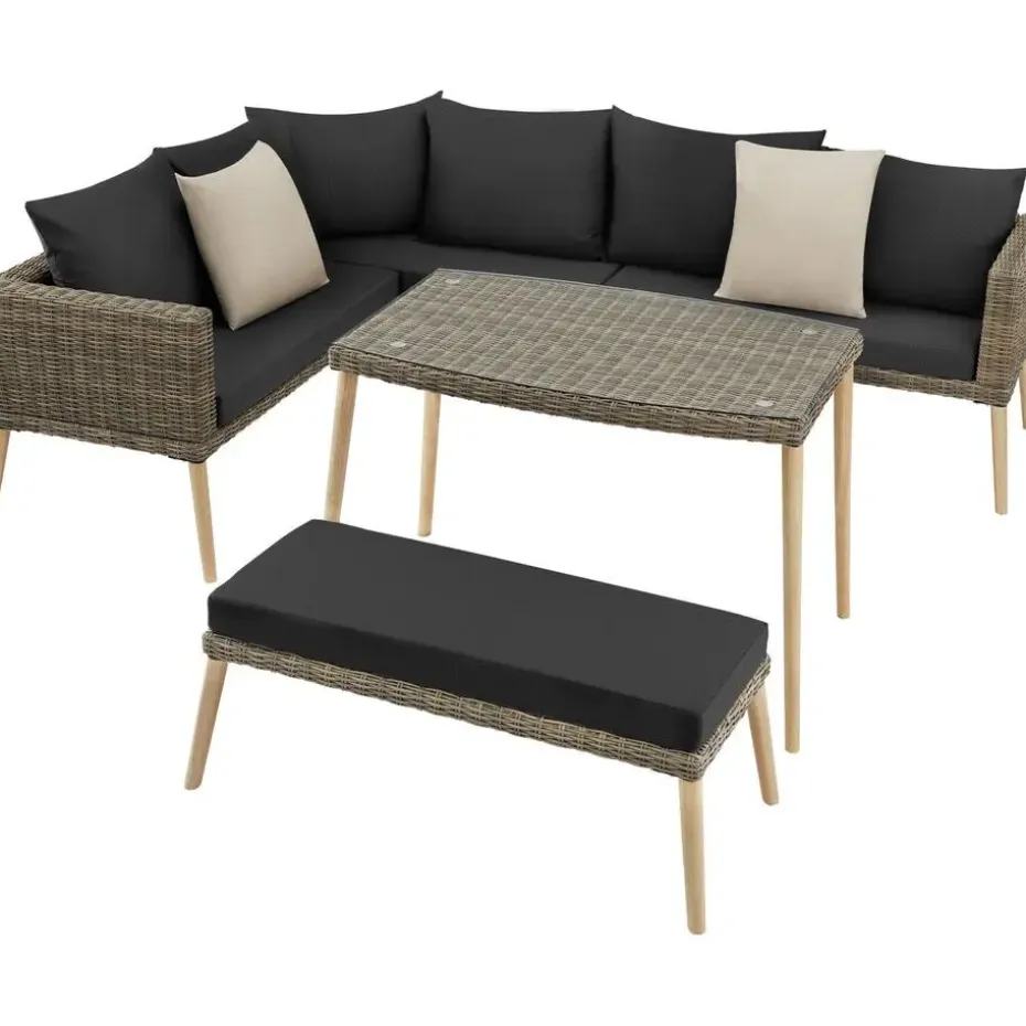 Haal een even uitnodigende als kwalitatieve set naar je buitenruimte met de charmante wicker Loungeset Pula. Het grote hoekstuk en de bank bieden voldoende ruimte, dikke kussens en rugkussens zorgen voor hoog comfort. De slanke houten poten en het stevige, ronde wicker vlechtwerk geven deze veelzijdige tuinset een zeer stijlvolle uitstraling. Met zijn lichte aluminium frame, stevige veiligheidsglasplaat en verstelbare schroefvoeten laat deze weerbestendige en onderhoudsvriendelijke set overtuigend zijn voordelen zien op het gebied van materiaal en ontwerp. Let op: Montage vereist