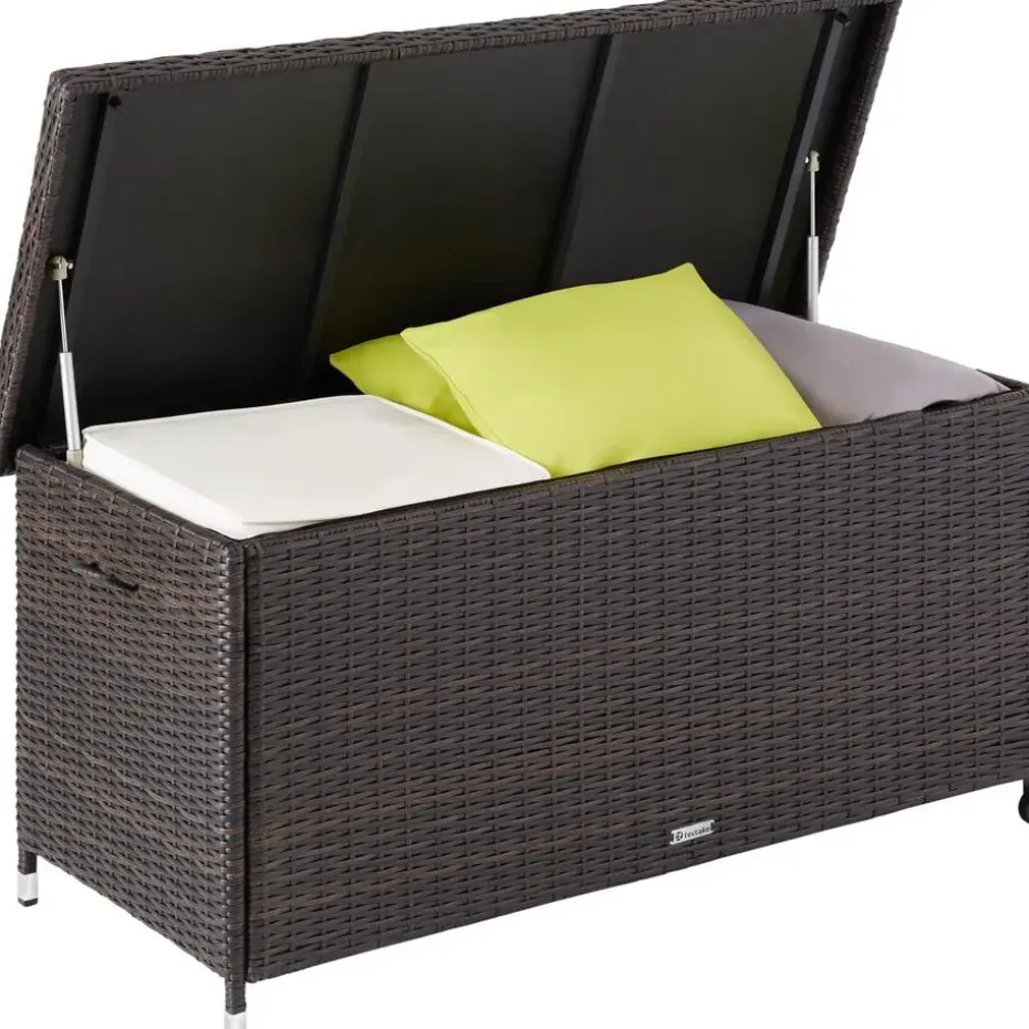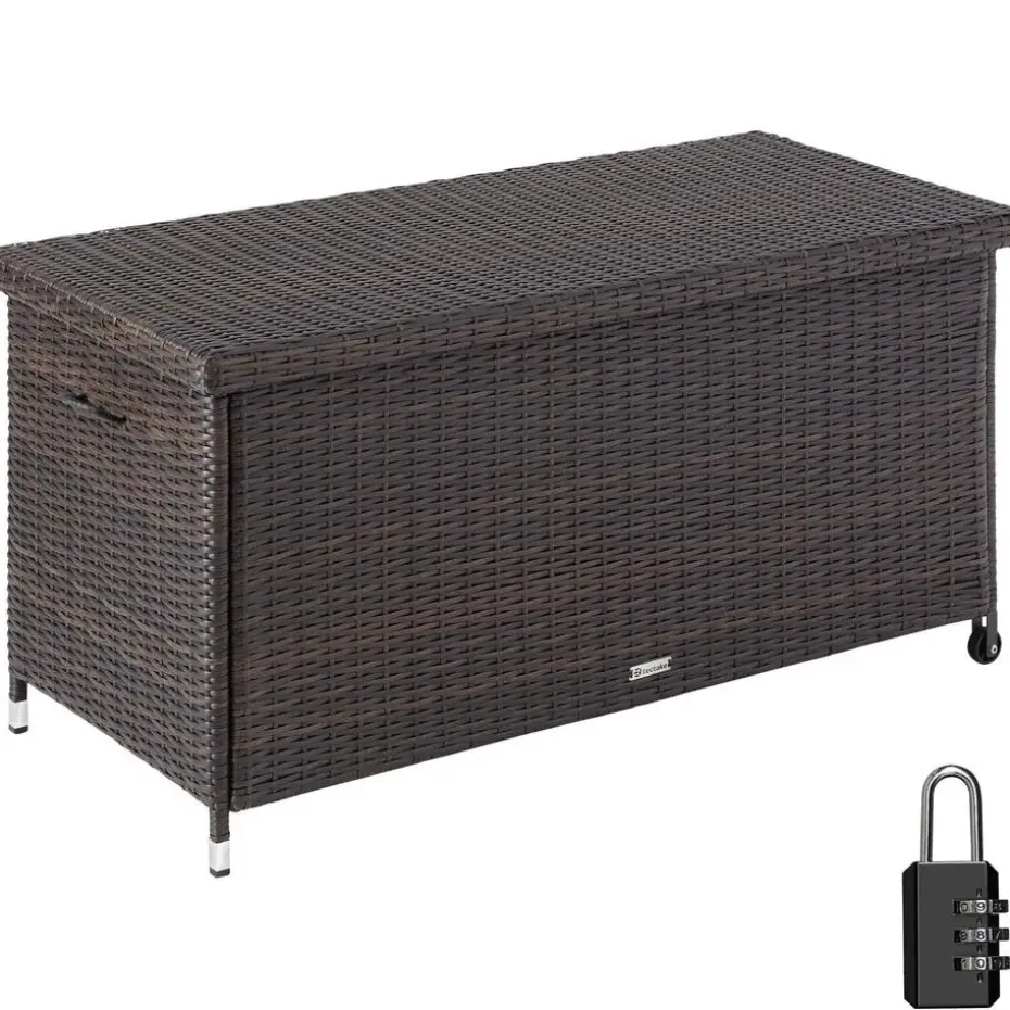 Met zijn grote opbergruimte is de praktische opbergbox Kiruna een ideale aanvulling op elke buitenruimte. Onder de verstevigde hoes bevindt zich een afsluitbare binnenzak die stof, vuil en vocht buiten houdt en extra kan worden beveiligd met het meegeleverde cijferslot. Dankzij de twee handgrepen en de twee zwenkwielen is de compacte constructie met het stevige stalen frame gemakkelijk te verplaatsen. Deze stijlvolle en veelzijdige wicker opbergbox kan eenvoudig in elke tuinomgeving worden geïntegreerd. Let op: Montage vereist