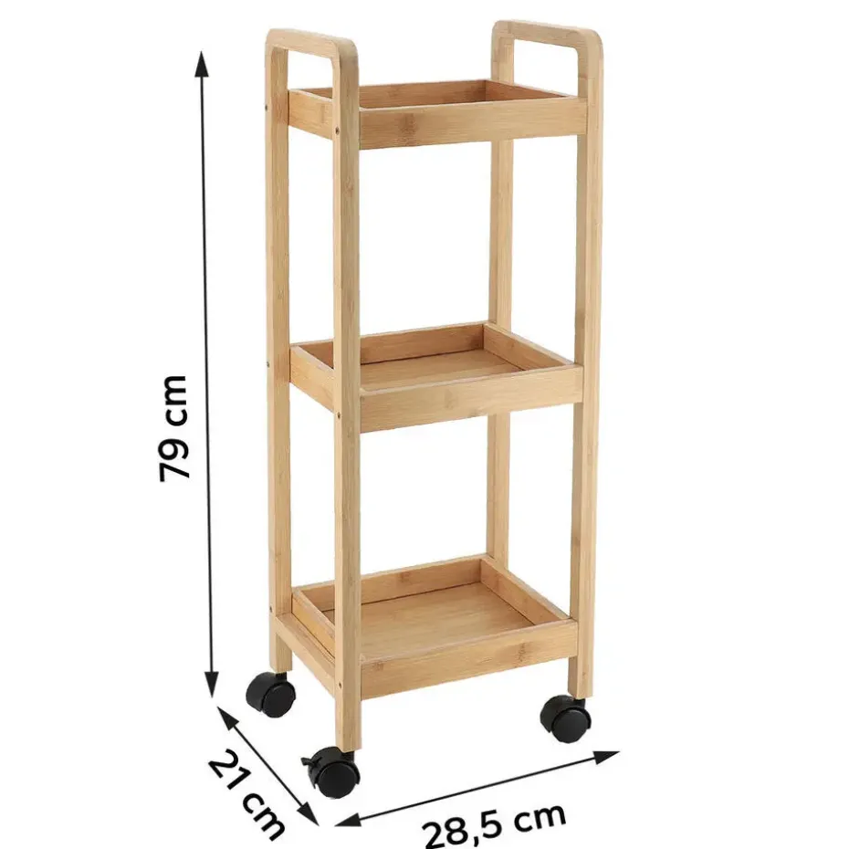 Deze 3-laagse keukentrolley/badkamer trolley is een praktische en stijlvolle oplossing voor extra opbergruimte in de keuken of de badkamer. De trolley is vervaardigd uit hoogwaardig bamboe hout en is voorzien van vier soepel rollende wieltjes, waardoor je hem gemakkelijk kunt verplaatsen. Met zijn compacte afmetingen past hij perfect in kleinere keukens, badkamers, of andere ruimtes waar je flexibele opbergruimte nodig hebt. Met deze keukentrolley op wieltjes creeer je extra opbergruimte waar je maar wilt, en de 3-laagse indeling maakt hem veelzijdig en ideaal voor dagelijks gebruik in elke ruimte van het huis! Afmeting trolley: ca. 46 x 14 x 48 cm. Materiaal: kunststof. Merk: Tendance.