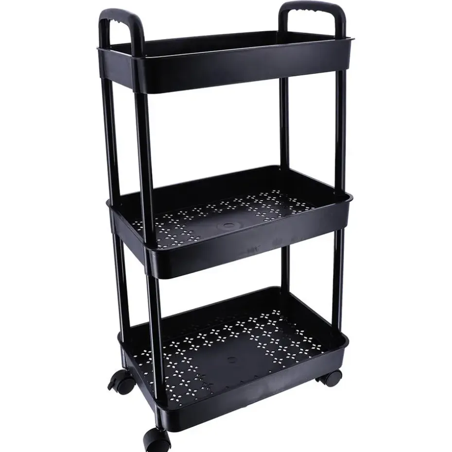 Op zoek naar een handige en hippe opbergoplossing? Deze Tendance trolley heeft alles wat je nodig hebt! Met drie ruime lagen biedt hij genoeg ruimte voor je spullen, of je nu in de keuken of badkamer aan het werk bent. Het strakke zwarte design maakt ‘m een echte eyecatcher, terwijl de wieltjes ervoor zorgen dat je hem makkelijk verplaatst – van keuken tot badkamer en weer terug. Compact, praktisch en stijlvol: deze trolley heeft alles in huis om je ruimte netjes en georganiseerd te houden! Met deze trolley rolt je organisatie tot in de puntjes – stijlvol en praktisch in een! Afmeting trolley: ca. 38 x 26 x 77 cm. Materiaal: kunststof. Merk: Tendance.
