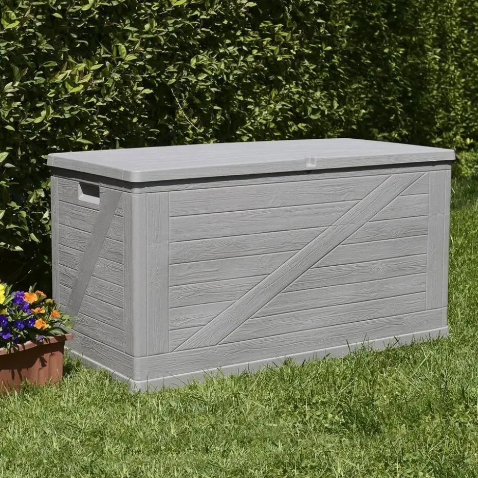 De Toomax Wood opbergbox is de perfecte oplossing voor het opbergen van kussens, tuinaccessoires en andere spullen in je tuin of op je terras. Deze stijlvolle en functionele opbergbox biedt een combinatie van gebruiksgemak, duurzaamheid en een aantrekkelijk ontwerp in de wood-stijl. Door het grote volume van maar liefst 420 liter is er genoeg plek voor het opbergen van tuinkussens of verschillende soorten tuingereedschap. De opbergbox beschikt over een hangslotvoorziening zodat je de box volledig kan afsluiten. (hangslot niet meegeleverd).