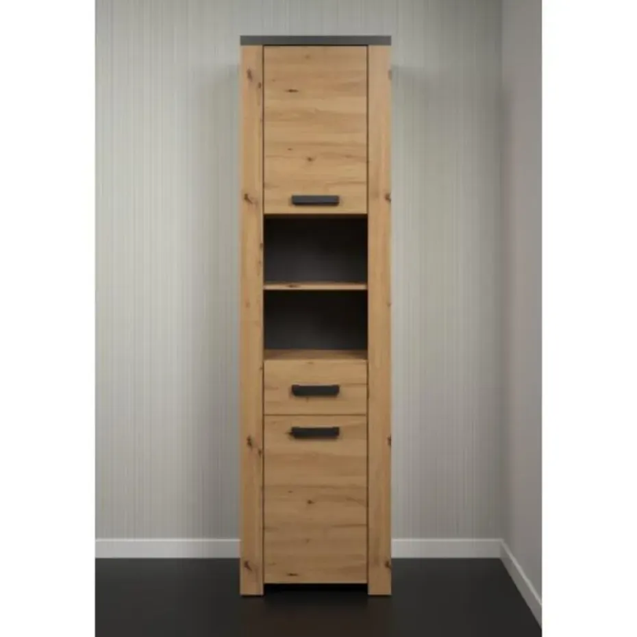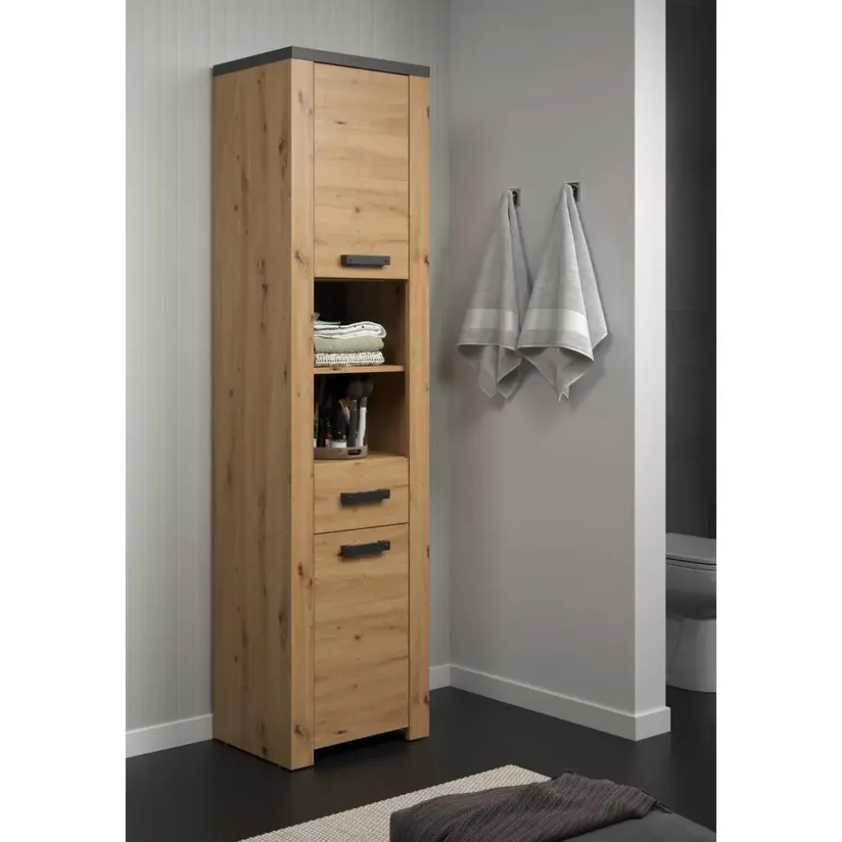Upgrade je badkamer met onze stijlvolle hoge badkamerkast uit de Follow-serie. Deze kast, met zijn elegante Artisan Oak-ontwerp, combineert functionaliteit en esthetiek perfect. Met twee draaideuren, een handige lade en twee open opbergvakken, biedt deze kast ruimte voor al je badkamerbenodigdheden.