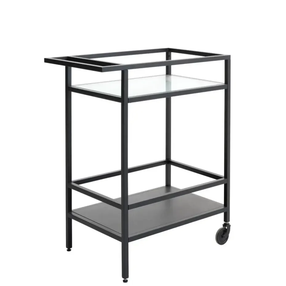Materiaal: De Trolley Bronco is vervaardigd uit een combinatie van glas en metaal. Deze materialen zorgen niet alleen voor een stevige constructie, maar geven de trolley ook een moderne en industriële uitstraling. Het glas biedt een elegante touch, terwijl het metaal zorgt voor stabiliteit en duurzaamheid.