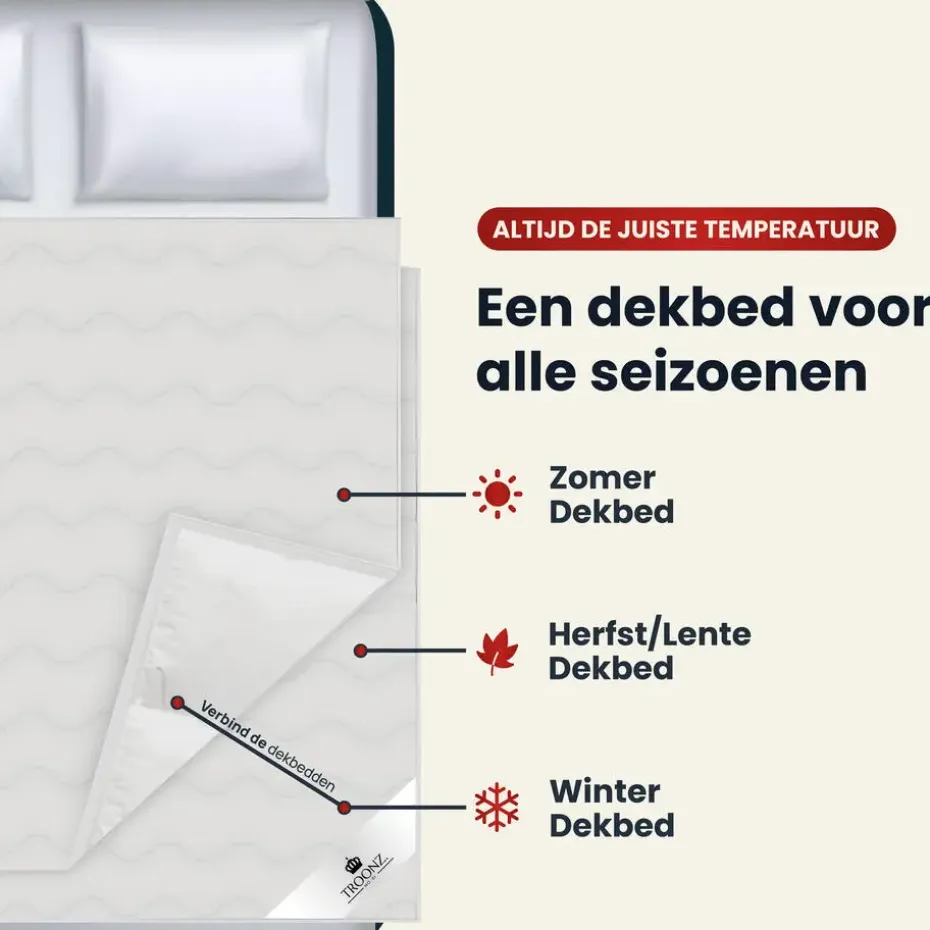 Ons 4 seizoenen Portofino dekbed is perfect voor elk seizoen. Het bestaat uit twee verschillende lagen voor zomer en winter, zodat je het hele jaar door goed slaapt en nooit meer naar een tweede dekbed hoeft te zoeken. De zomerlaag is ademend en lichtgewicht, waardoor je minder zweet tijdens het slapen. De winterlaag is isolerend, zwaarder en dikker, zodat je lekker warm kunt overwinteren.