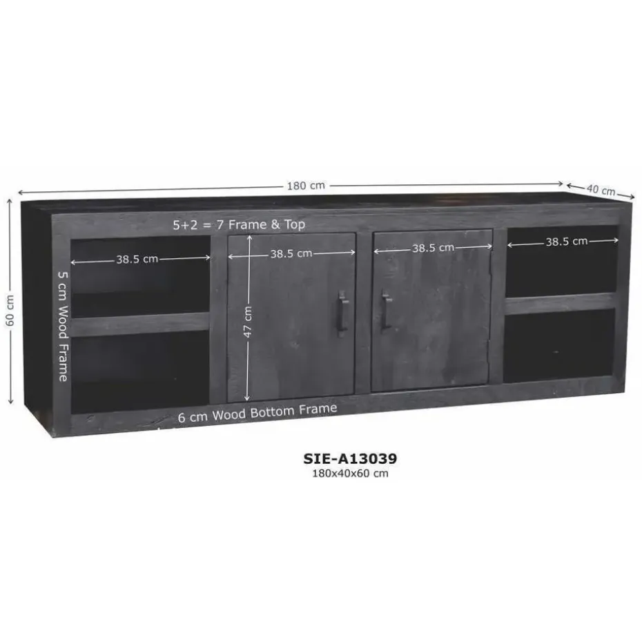 Ontdek de perfecte combinatie van stijl en functionaliteit met het Tv-Meubel Xander in een stoere industriële stijl. Vervaardigd uit hoogwaardig mangohout en afgewerkt in een diepzwarte kleur, biedt dit meubelstuk niet alleen een robuuste kwaliteit maar ook een stijlvolle uitstraling die in elk interieur past. Met zes handige vakken biedt het voldoende opbergruimte voor al je media-apparatuur en accessoires, terwijl het tegelijkertijd een eyecatcher in je woonkamer is.